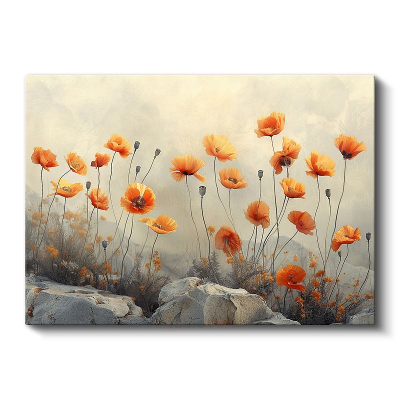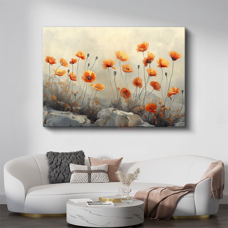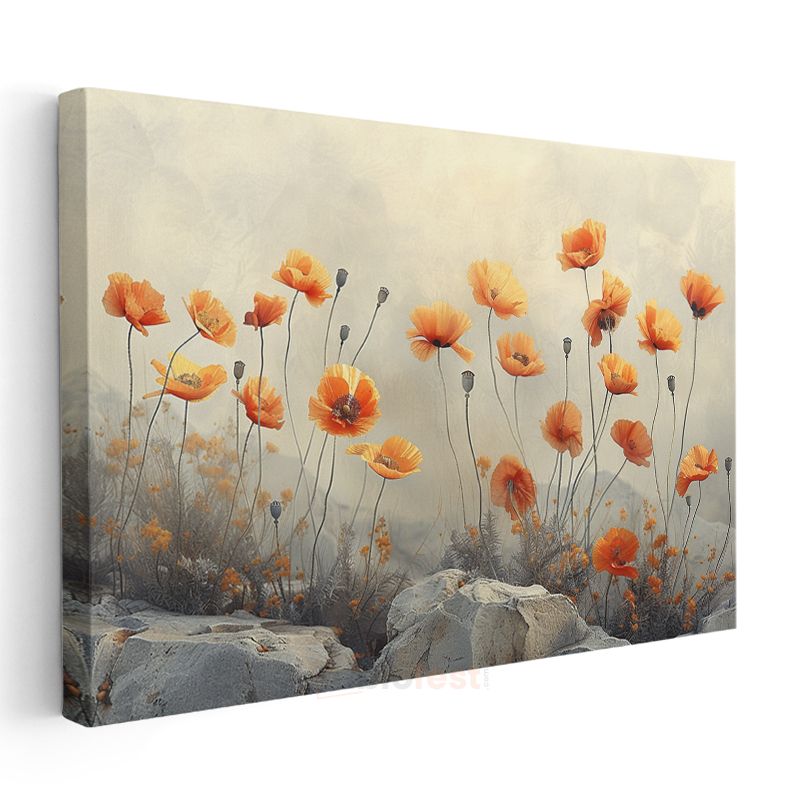 Turuncu Gelincikler - Sisli Manzarada Zarif Çiçek Tarlası Kanvas Tablo