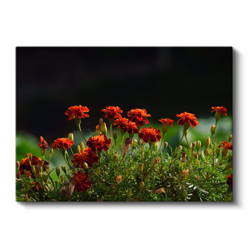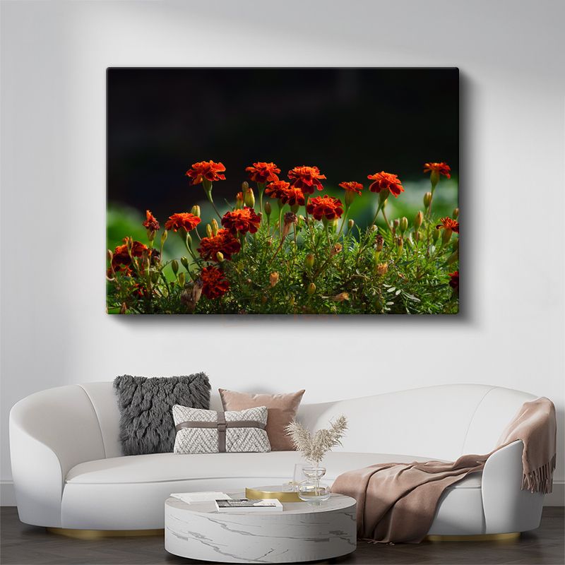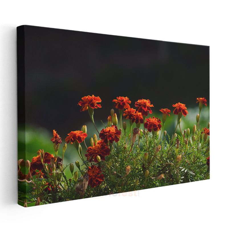 Turuncu Kadife Çiçekleri - Koyu Arka Planda Alev Renkli Bahçe Kanvas Tablo