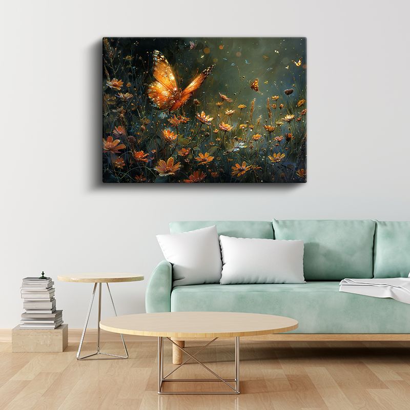 Turuncu Kanatlar - Çiçekli Alanda Kelebekler Kanvas Tablo
