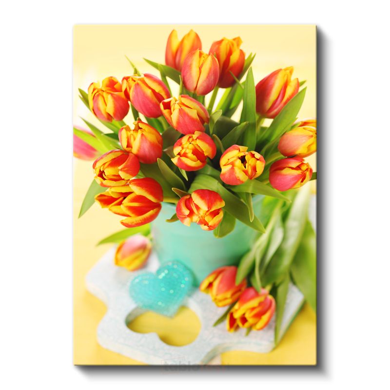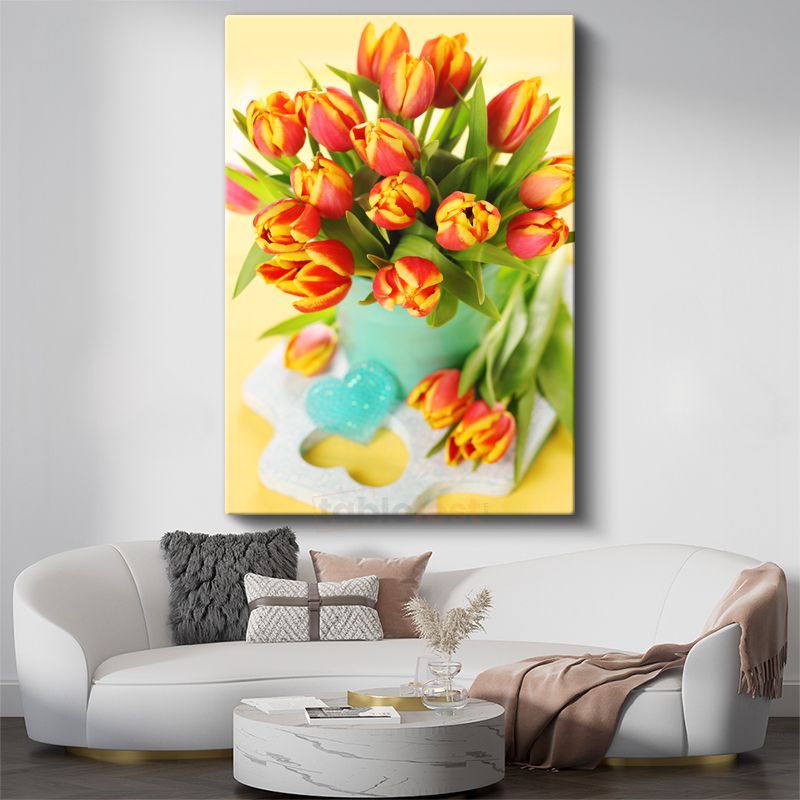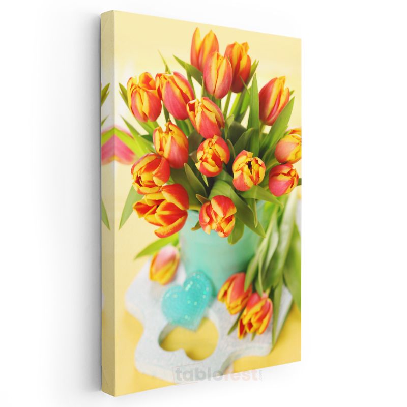 Turuncu Lale Buketi - Turkuaz Vazoda Bahar Çiçekleri Kanvas Tablo