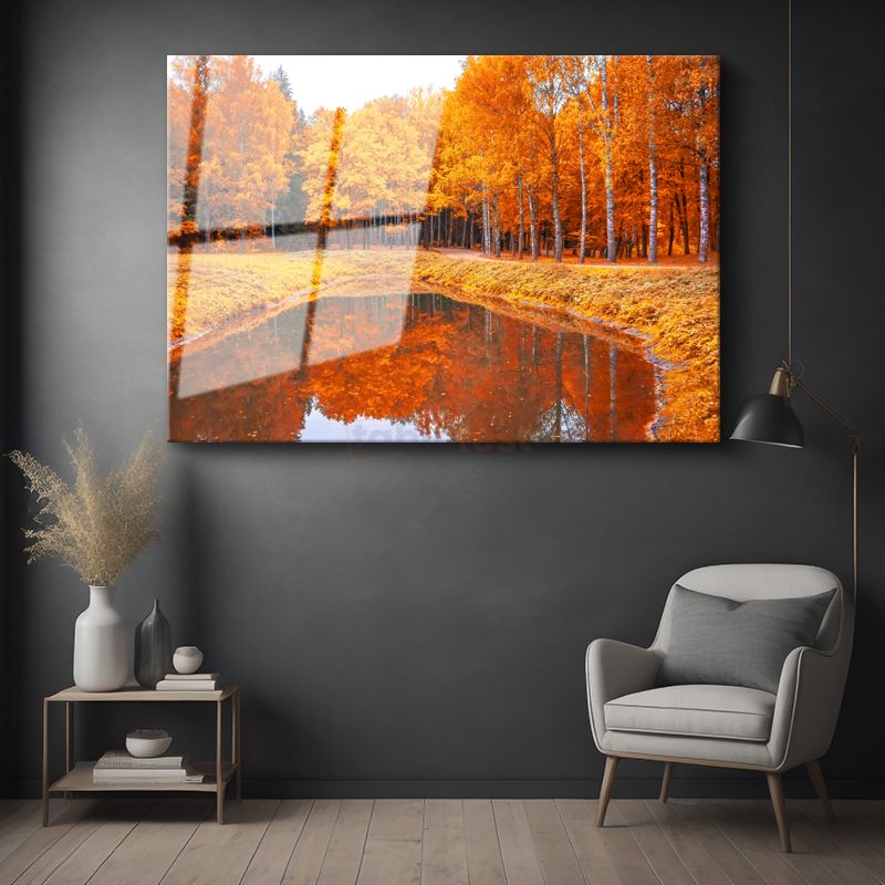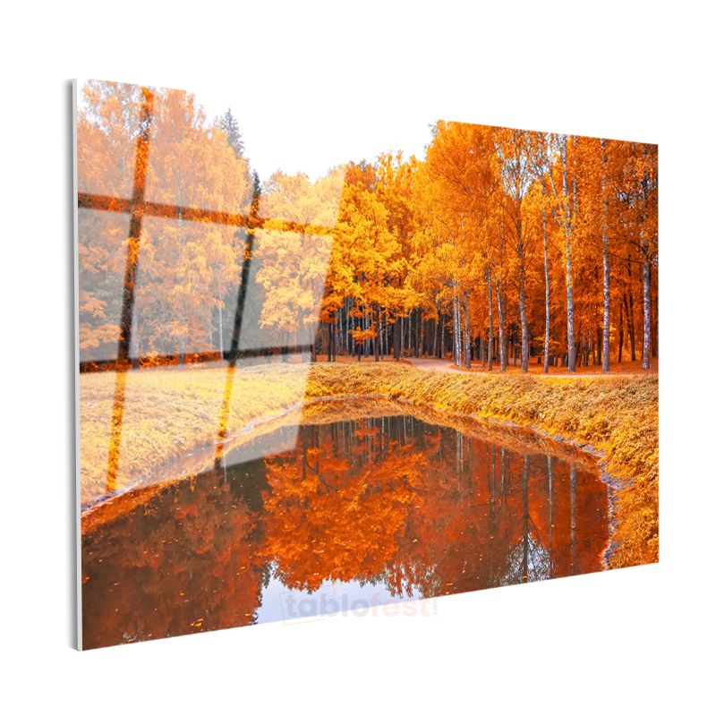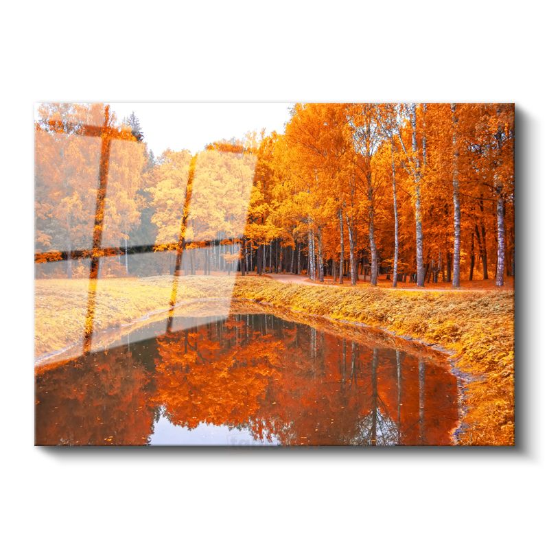 Turuncu Yansımalar - Sonbahar Gölet Manzarası Cam Tablo