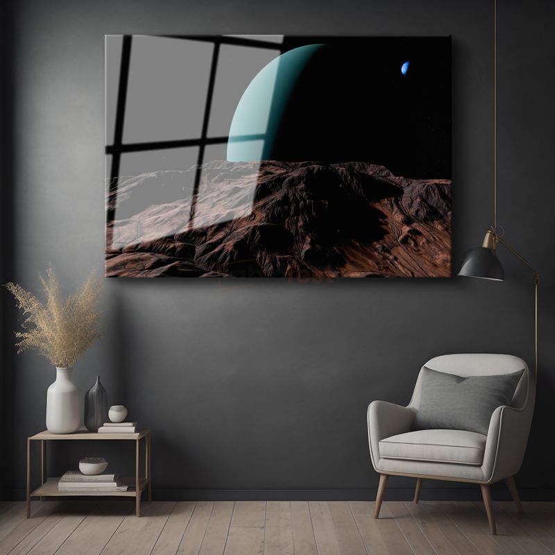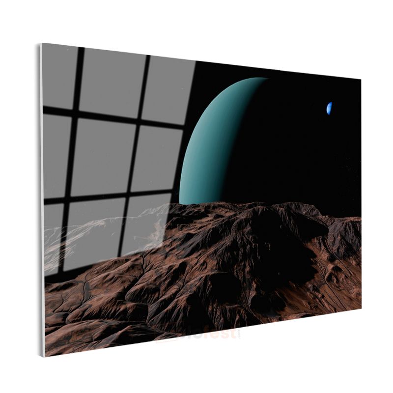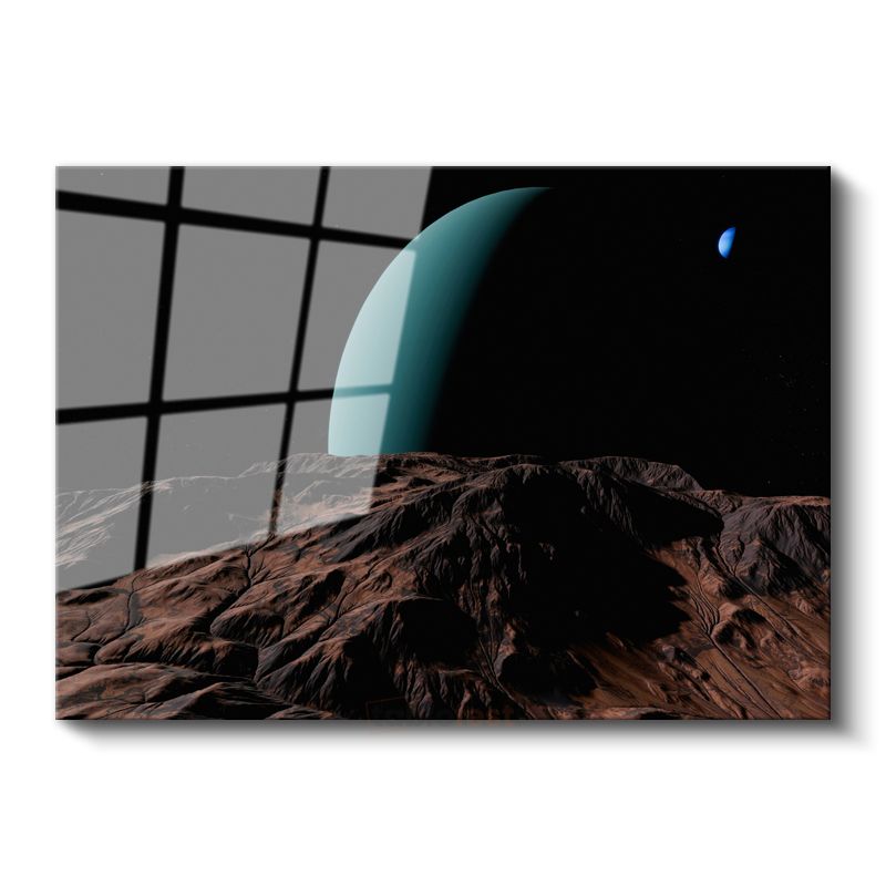 Uzak Dünyalar - Turkuaz Gezegen ve Kayalık Yüzey Cam Tablo