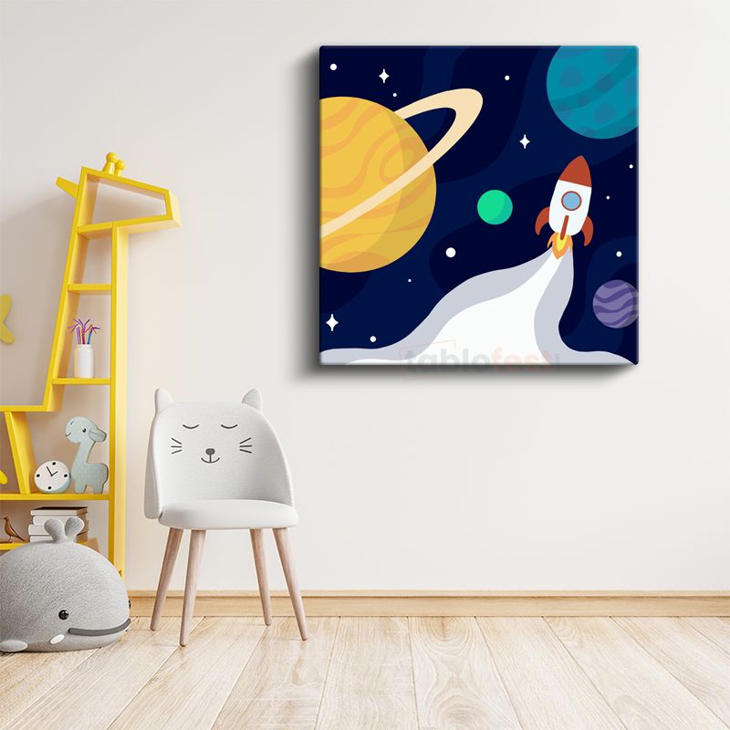 Uzay Macerası - Renkli Gezegenler ve Roket Kanvas Tablo
