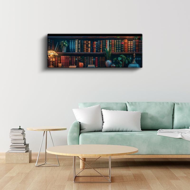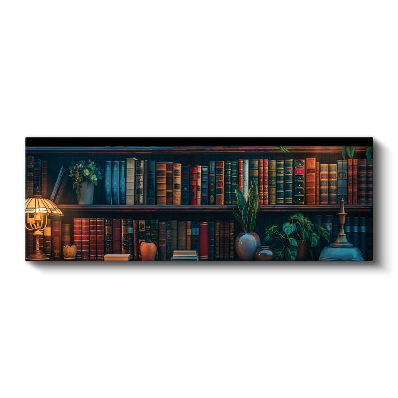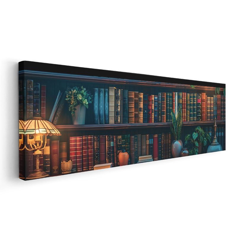 Vintage Kitaplık - Masa Lambası ve Yeşil Bitkilerle Zenginleştirilmiş Kanvas Tablo