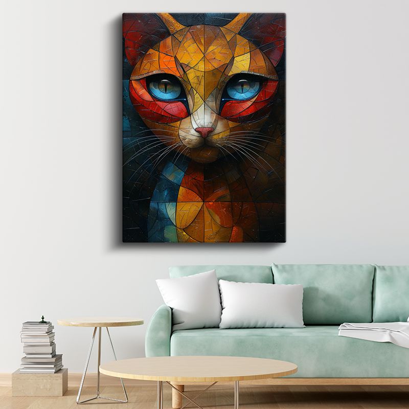 Vitray Kedi - Geometrik Desenlerde Renkli Bakışlar Kanvas Tablo