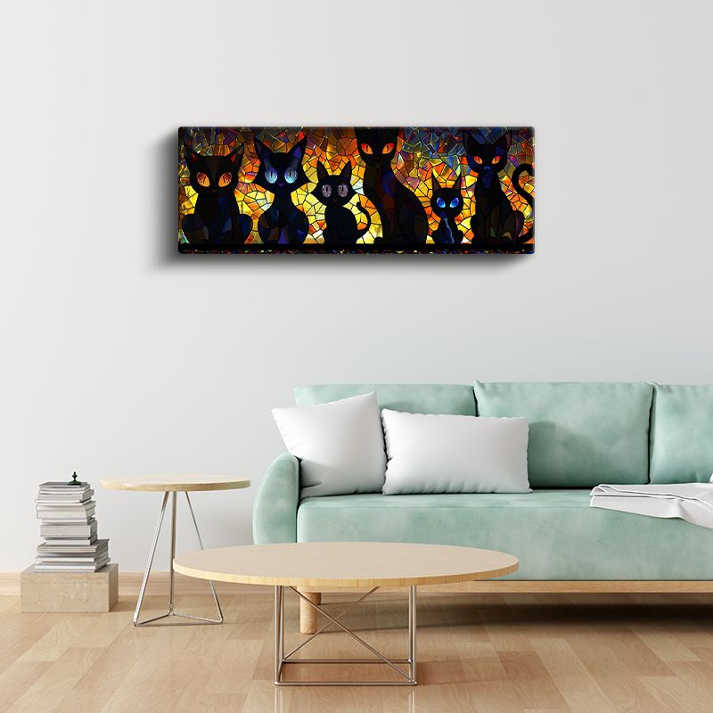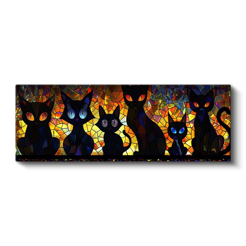Vitray Kediler - Renkli Cam Efektli Siyah Kedi Siluetleri Kanvas Tablo