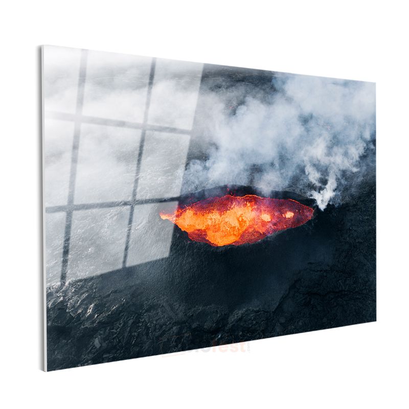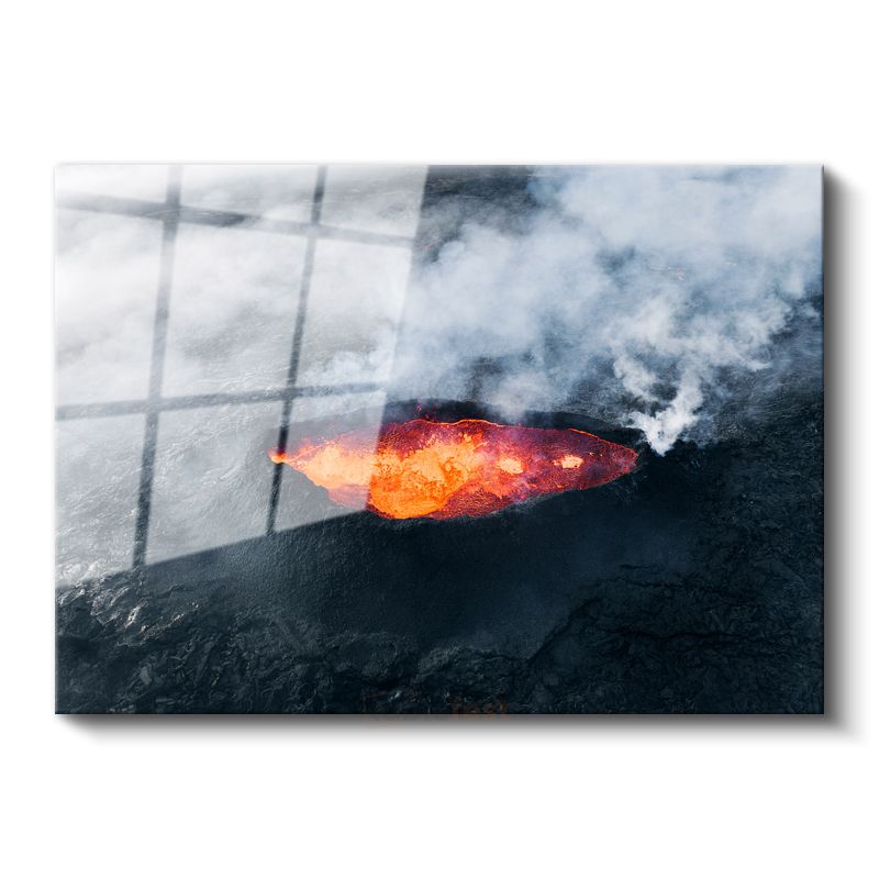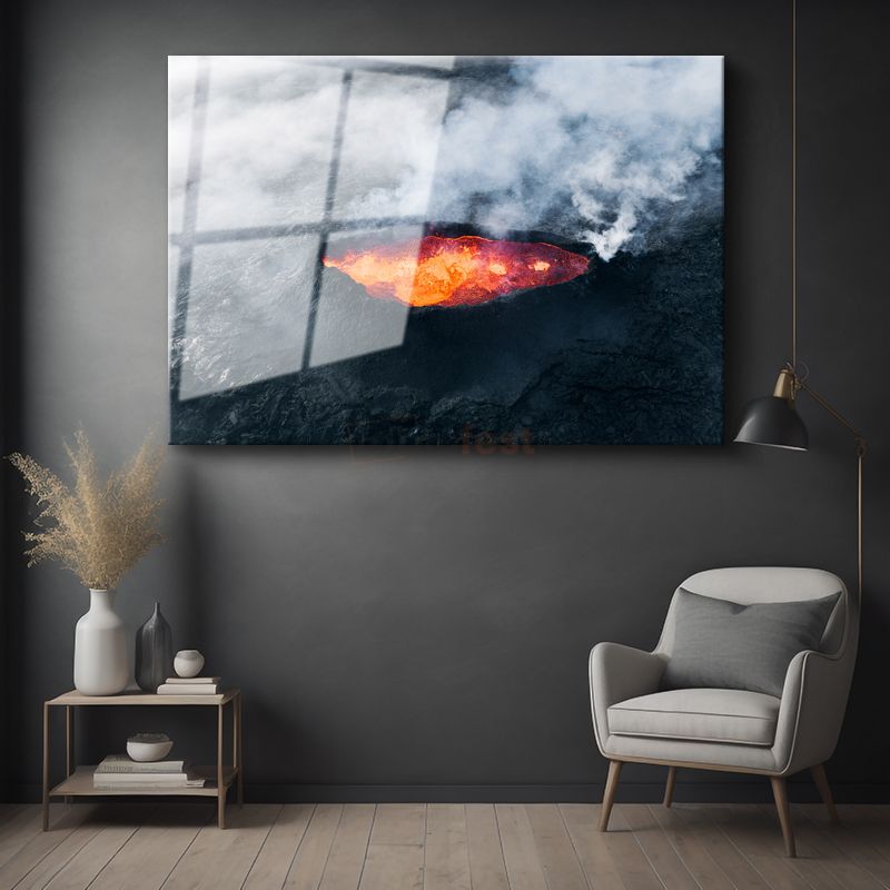 Volkan Krateri - Dumanlı Dağda Parlayan Lav Gölü Cam Tablo