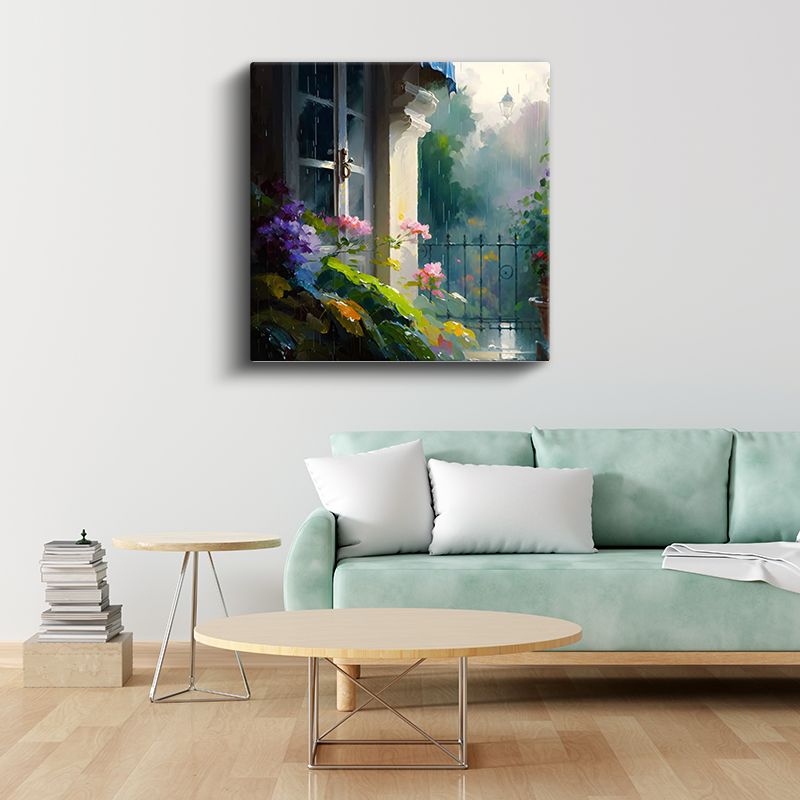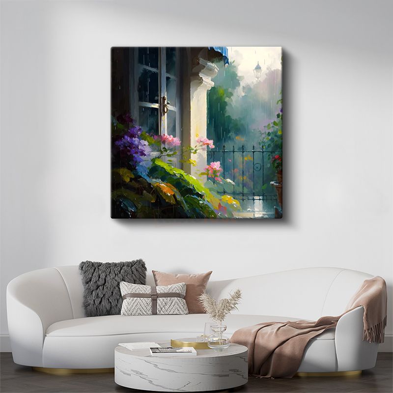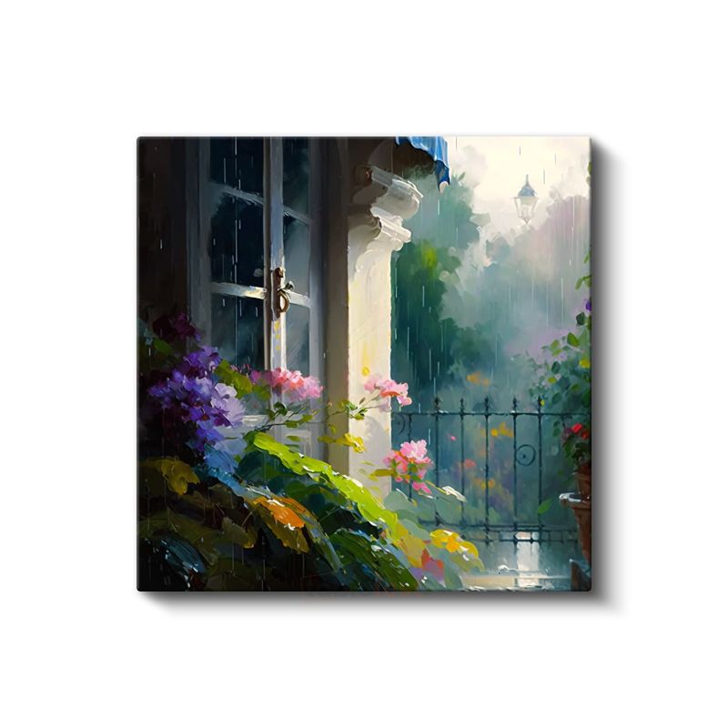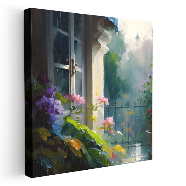 Yağmurlu Bahçe - Pencere Önünde Romantik Çiçek Kompozisyonu Kanvas Tablo