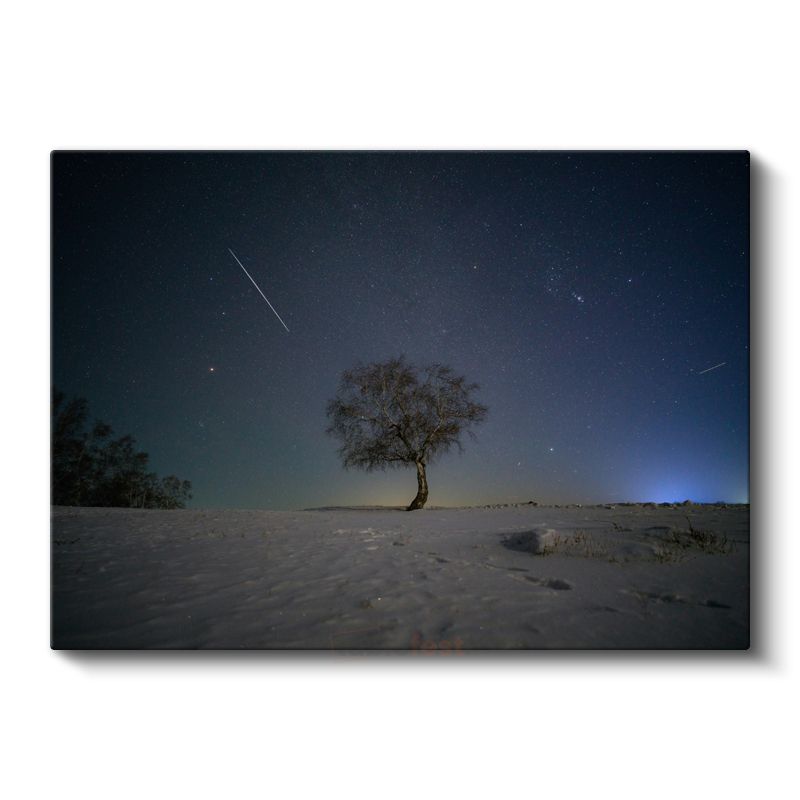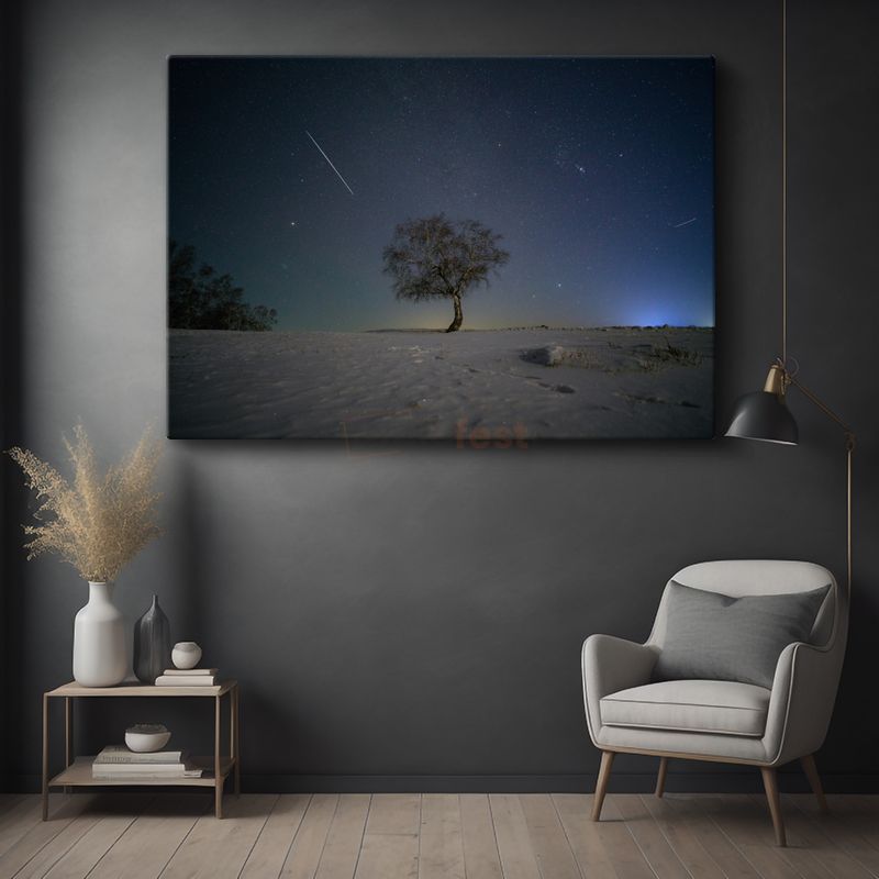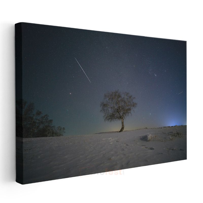 Yalnız Ağaç - Yıldızlı Gökyüzü Altında Kış Manzarası Kanvas Tablo