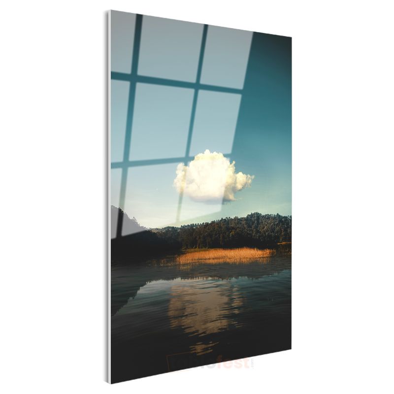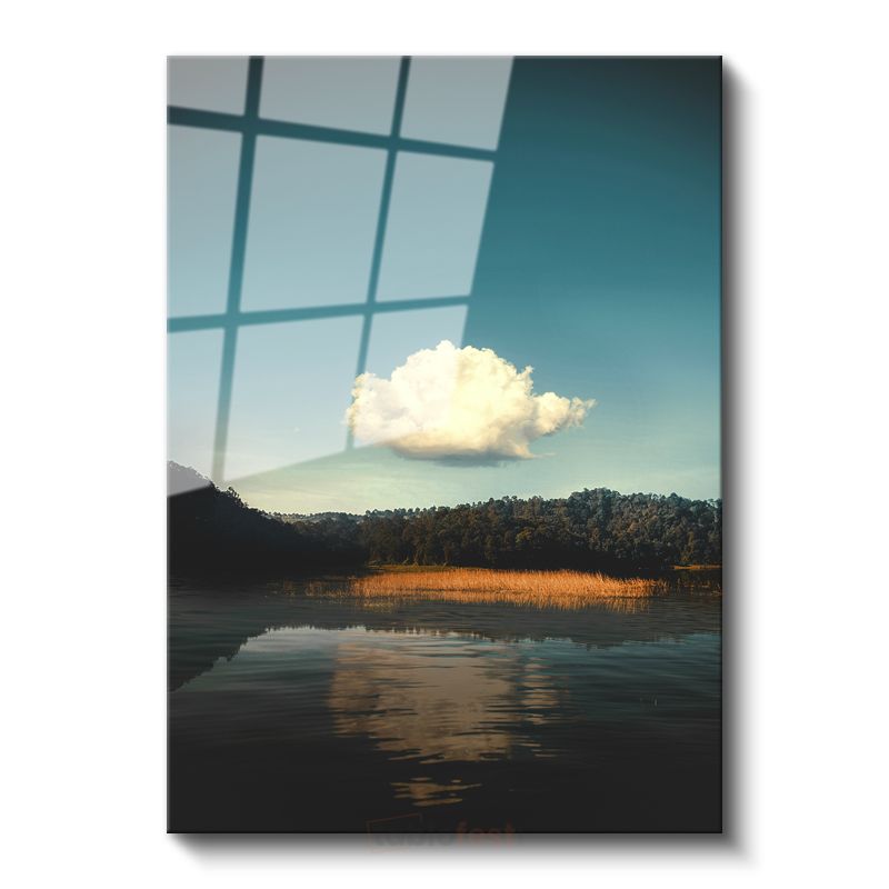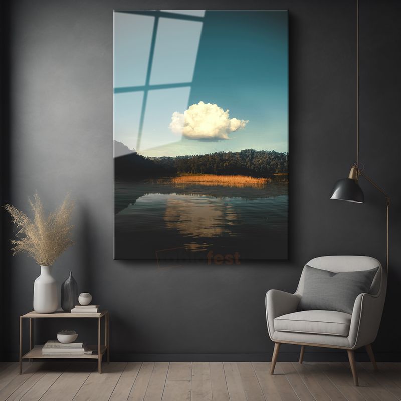 Yalnız Bulut - Orman Gölü Üzerinde Huzurlu Yansıma Cam Tablo