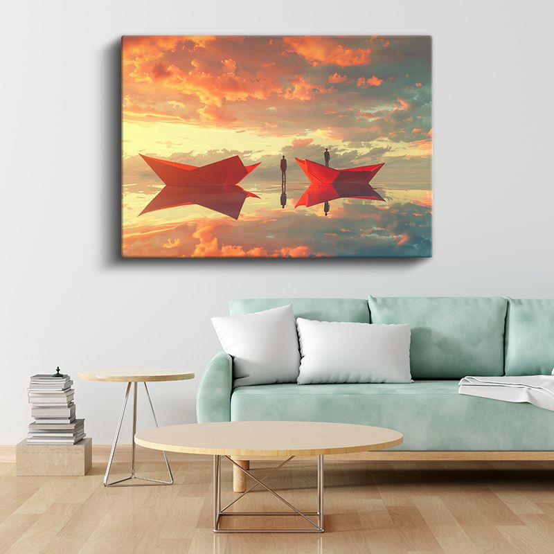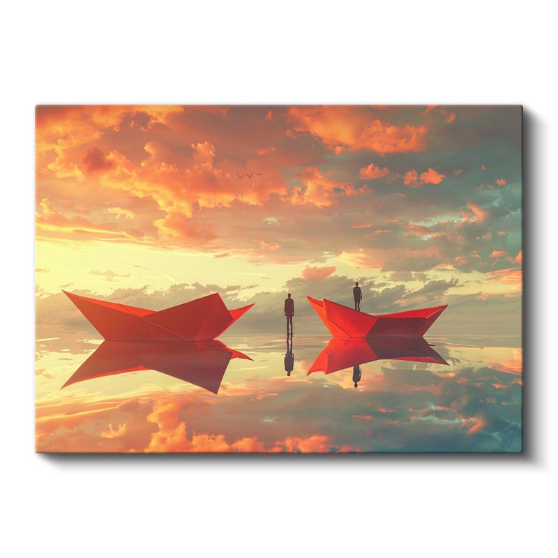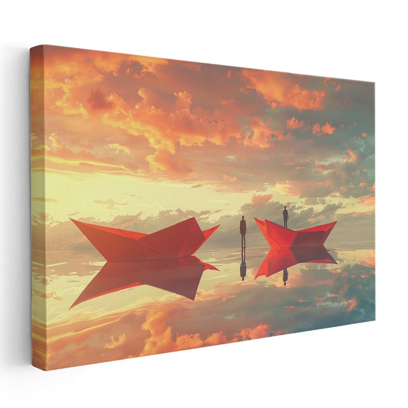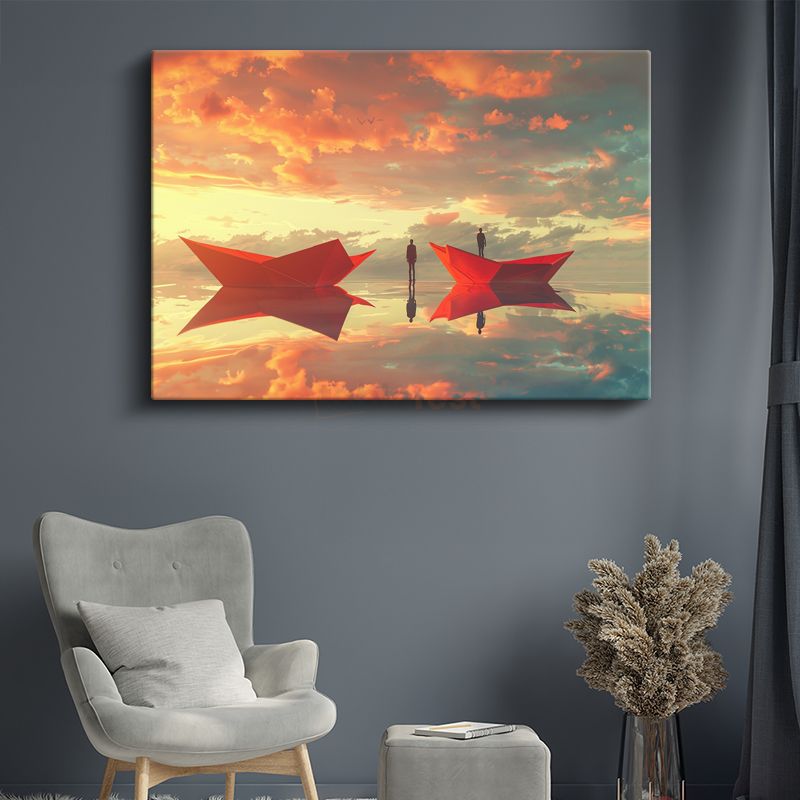 Yansımalar Dünyası - Kırmızı Kayıklarda Yolculuk Eden Siluetler Kanvas Tablo