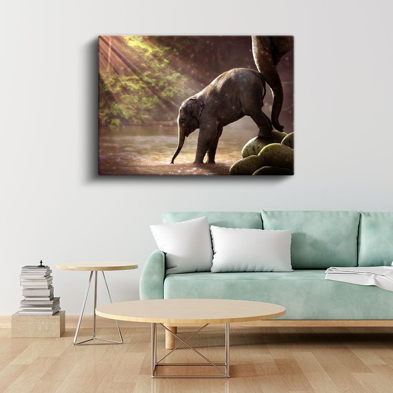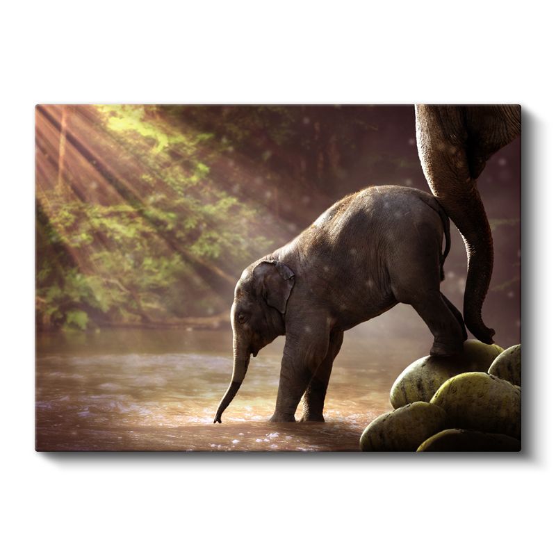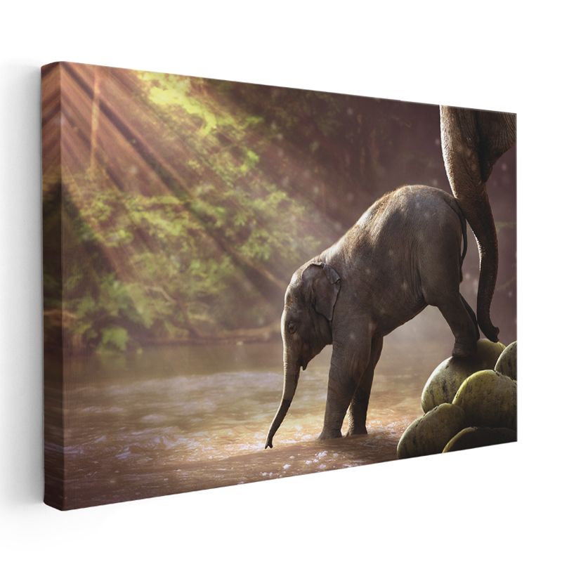 Yavru Fil - Nehirde İlk Adımlarını Atan Sevimli Bebek Kanvas Tablo