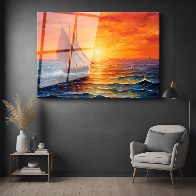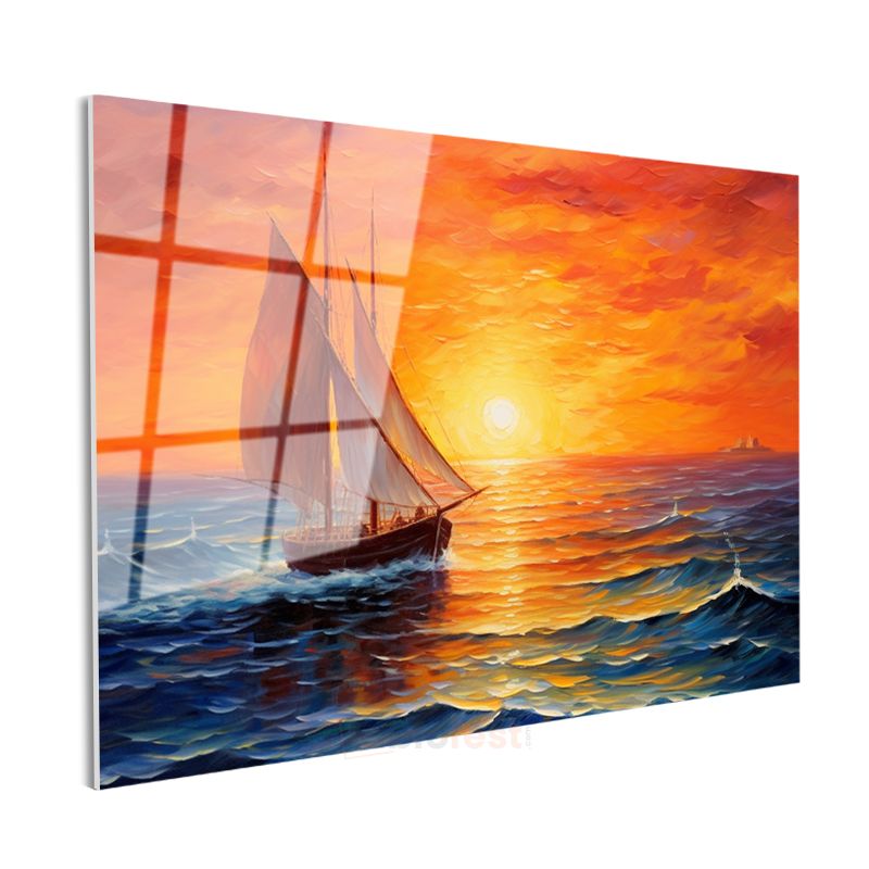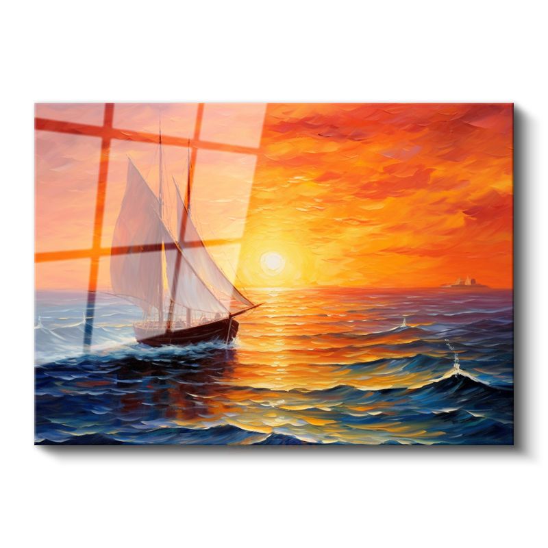 Yelkenli Gemi - Ateş Renkli Ufukta Dalgalı Deniz Cam Tablo