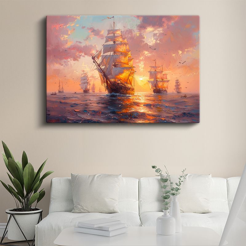 Yelkenli Gemiler - Altın Rengi Gün Batımında Filo Kanvas Tablo