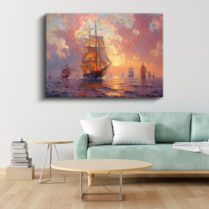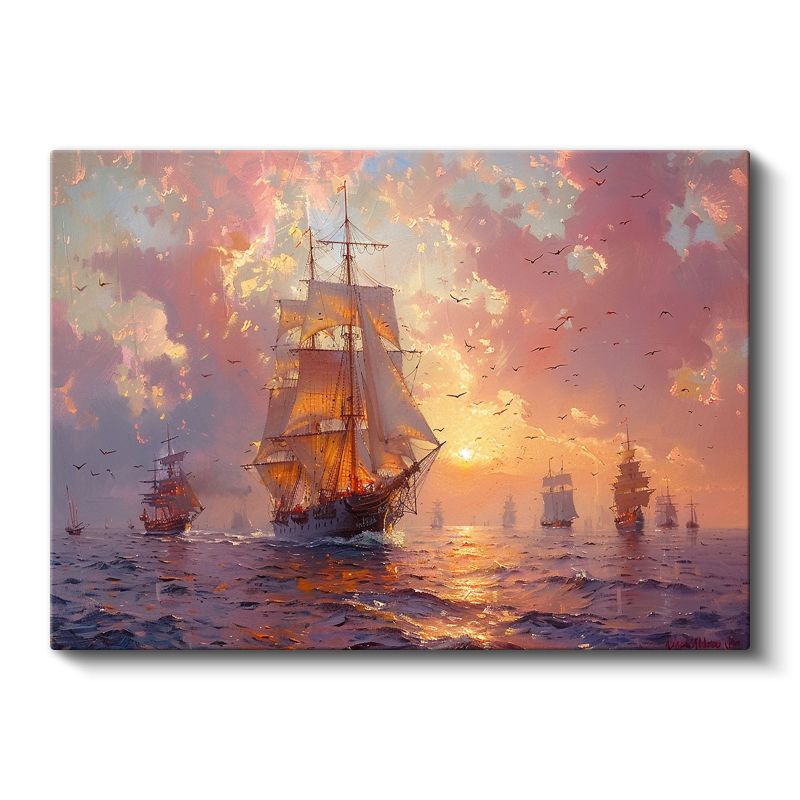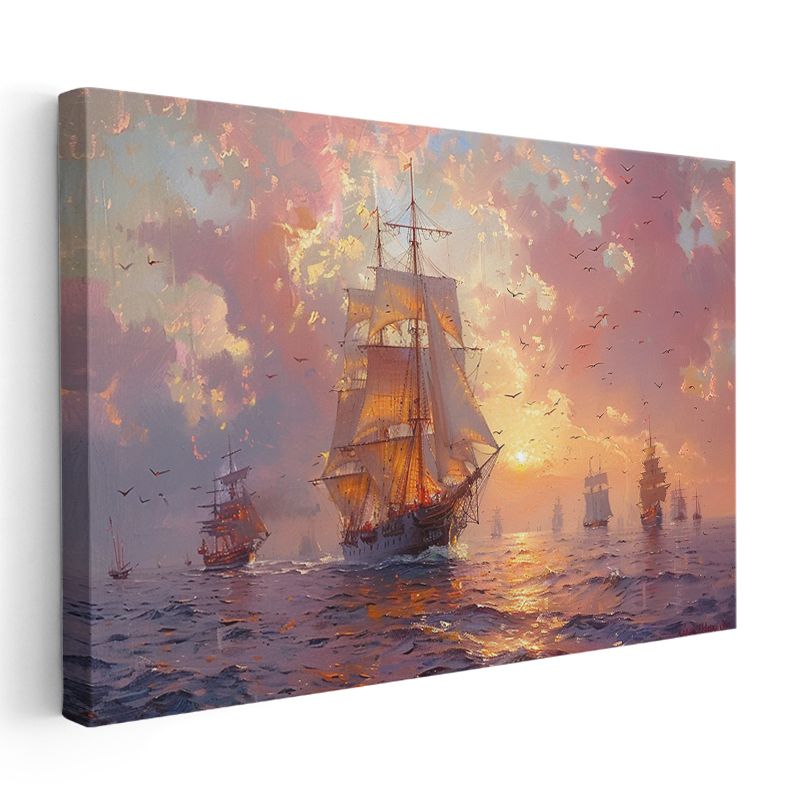 Yelkenli Gemiler - Pembe Gökyüzünde Deniz Yolculuğu Kanvas Tablo