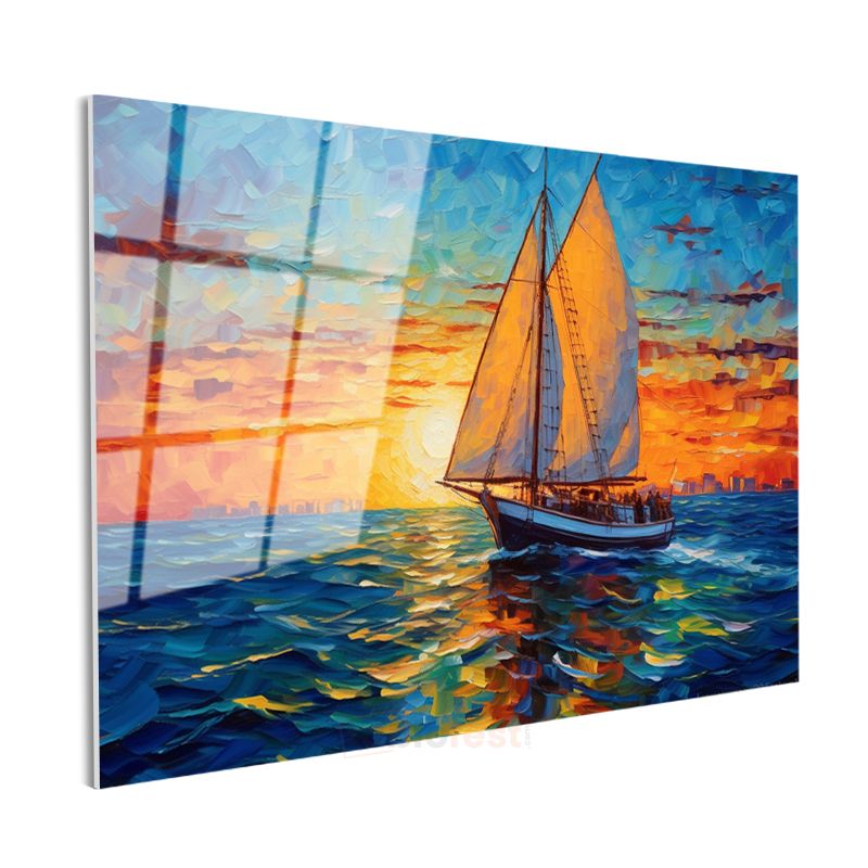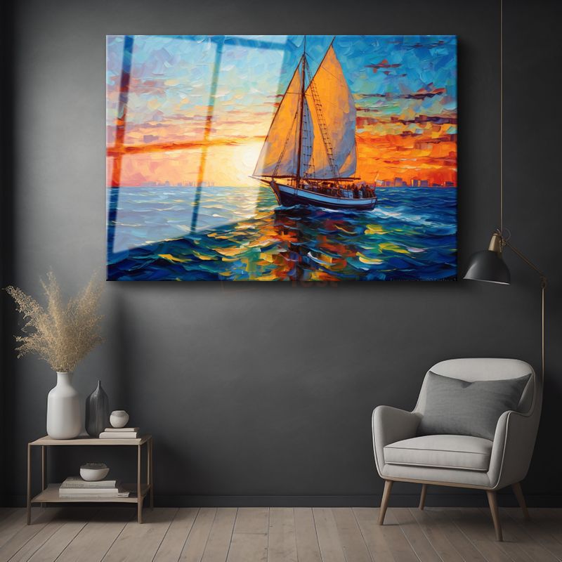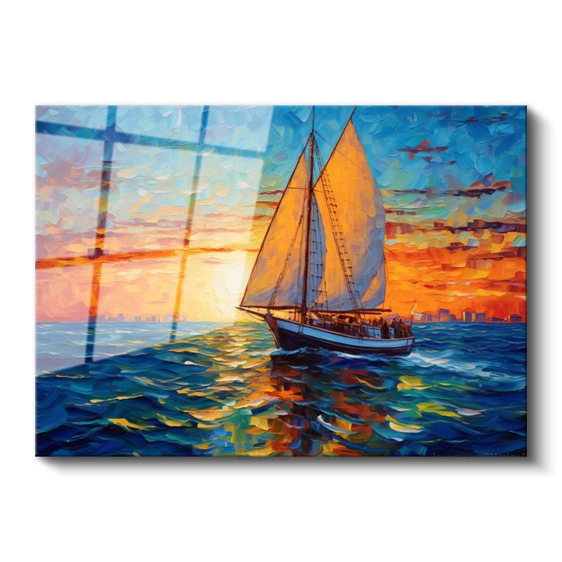 Yelkenli Tekne - Alev Renkli Günbatımı Seyri Cam Tablo
