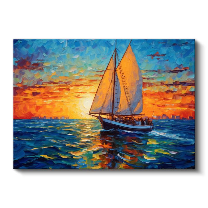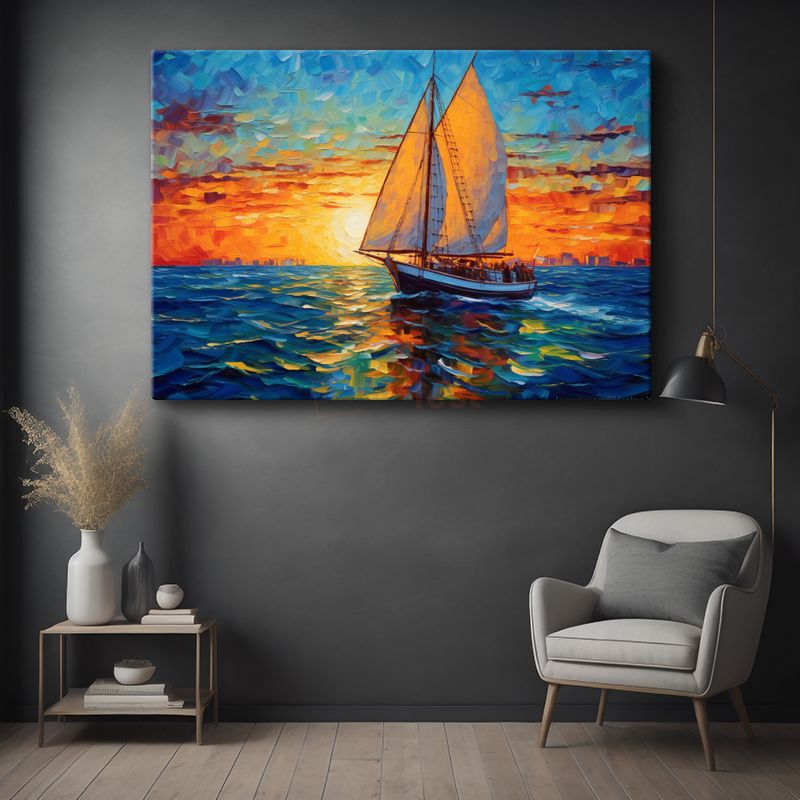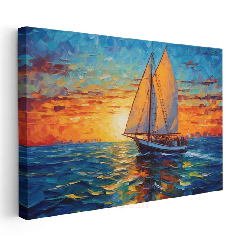 Yelkenli Tekne - Alev Renkli Günbatımı Seyri Kanvas Tablo