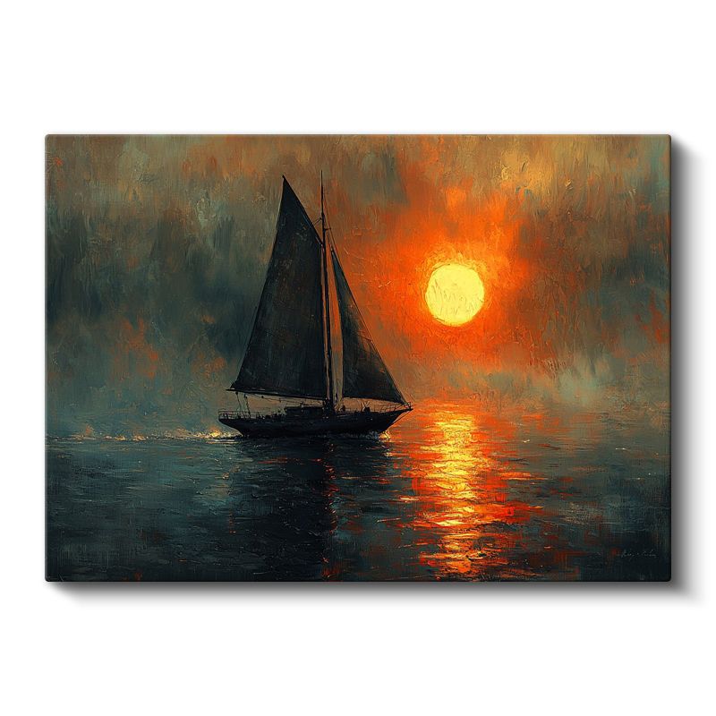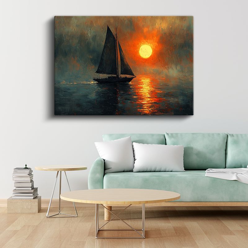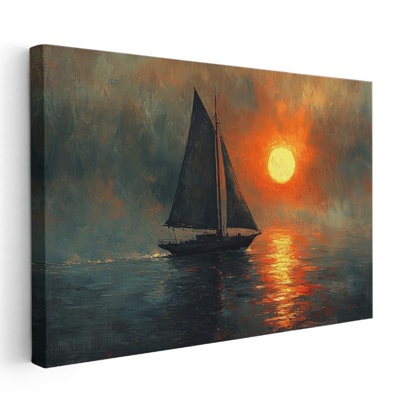 Yelkenli Tekne - Gün Batımında Denizde Kanvas Tablo