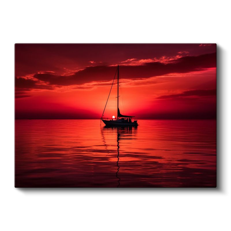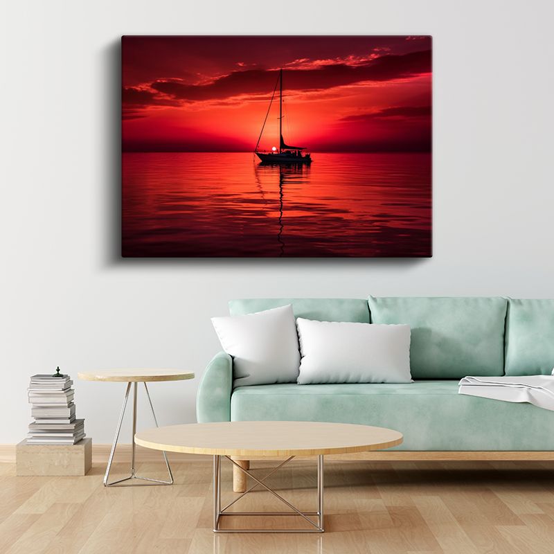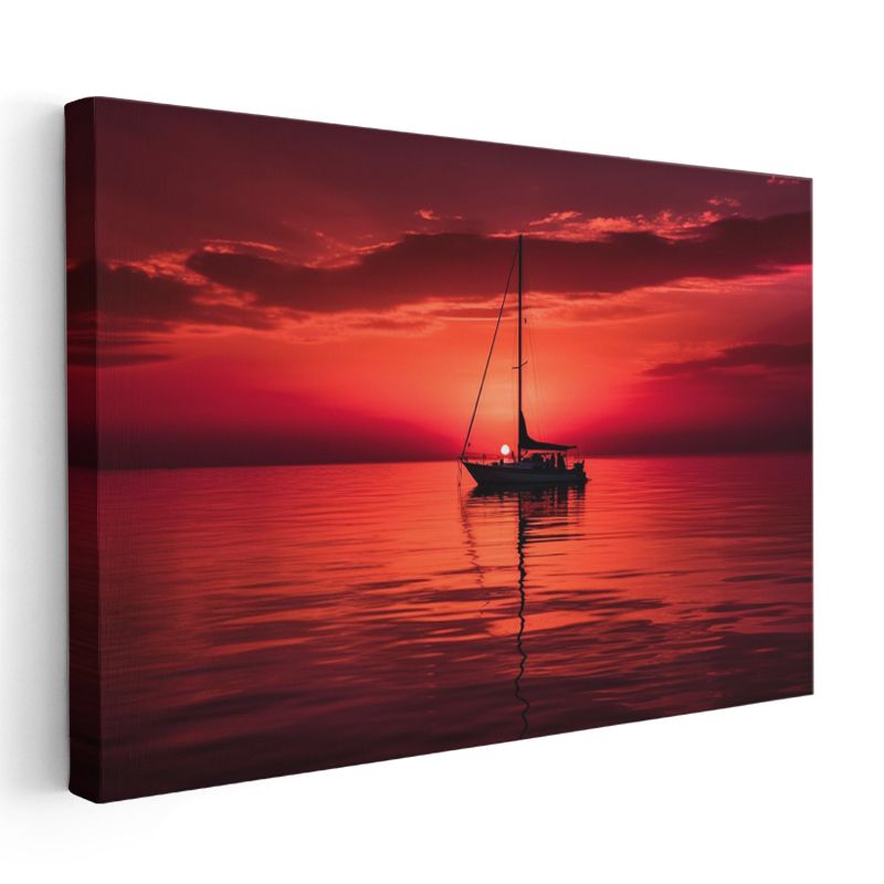 Yelkenli Tekne - Kızıl Gün Batımında Yalnız Seyir Kanvas Tablo