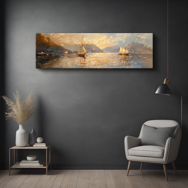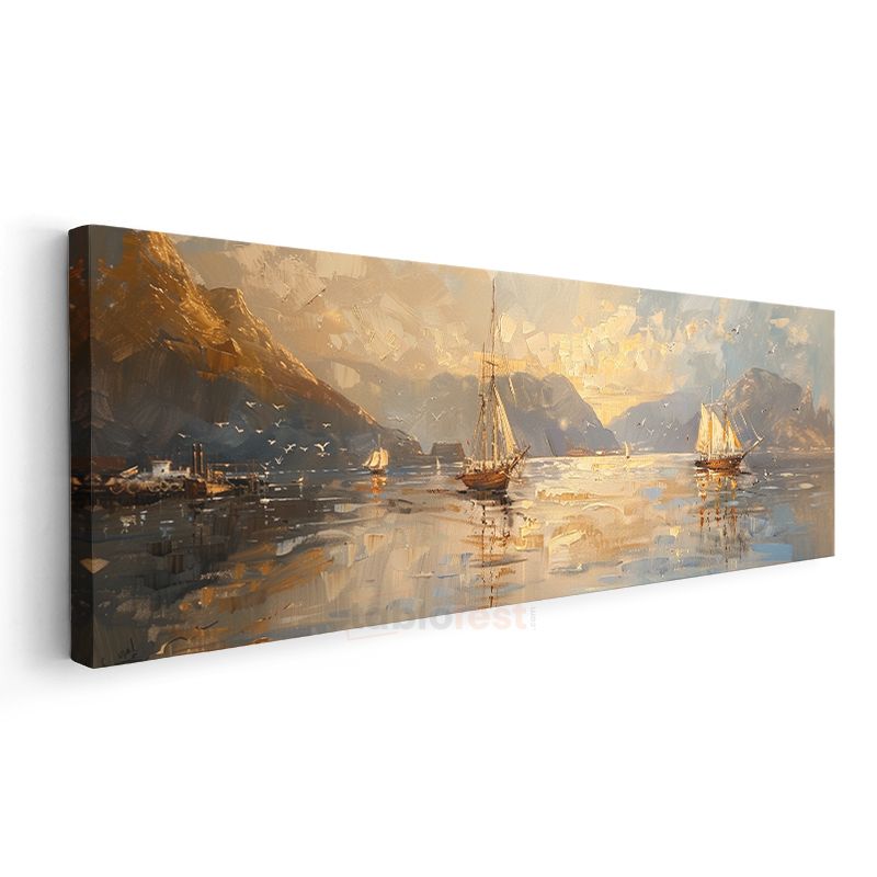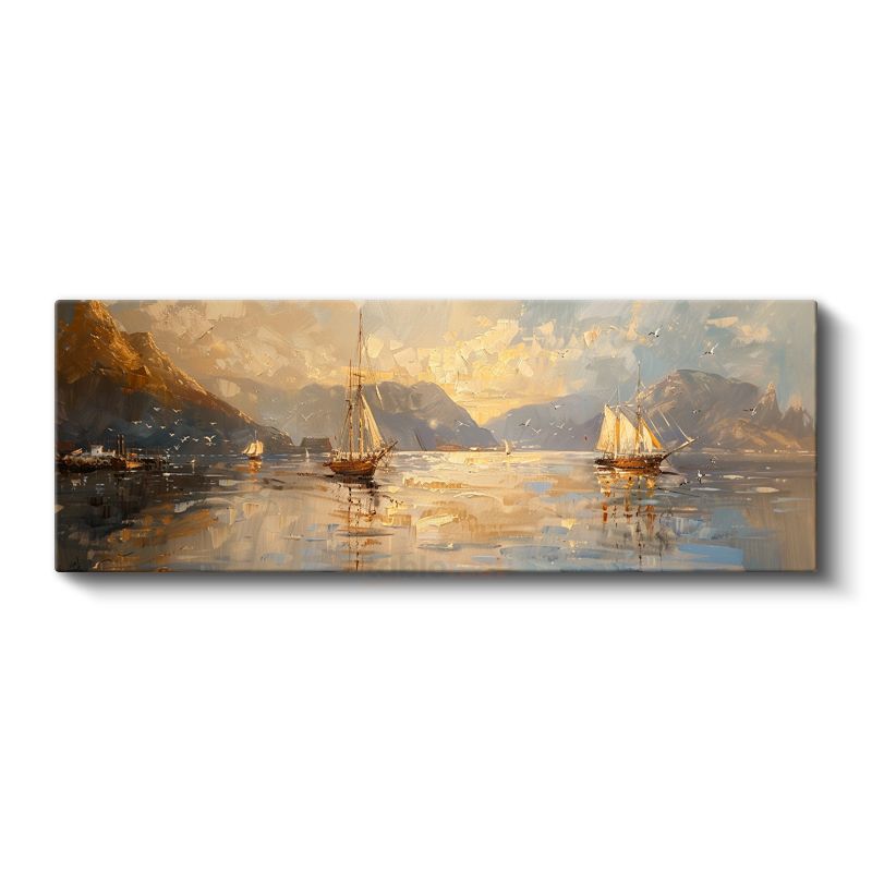 Yelkenli Tekneler - Altın Saatlerde Dağlar Arasında Huzurlu Yolculuk Kanvas Tablo