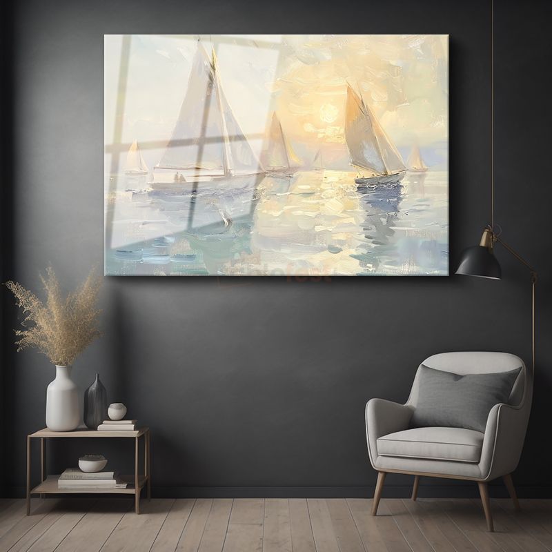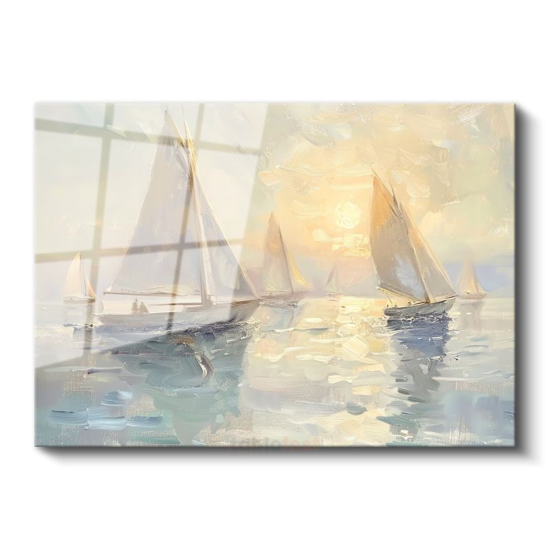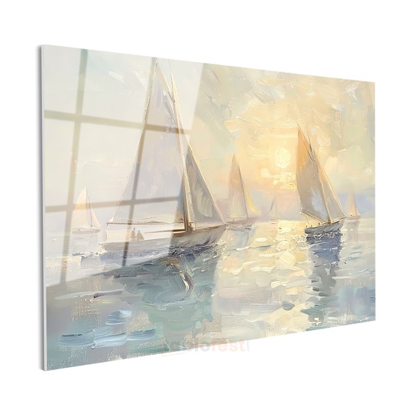 Yelkenliler - Sisli Sabahta Sakin Deniz Yolculuğu Cam Tablo