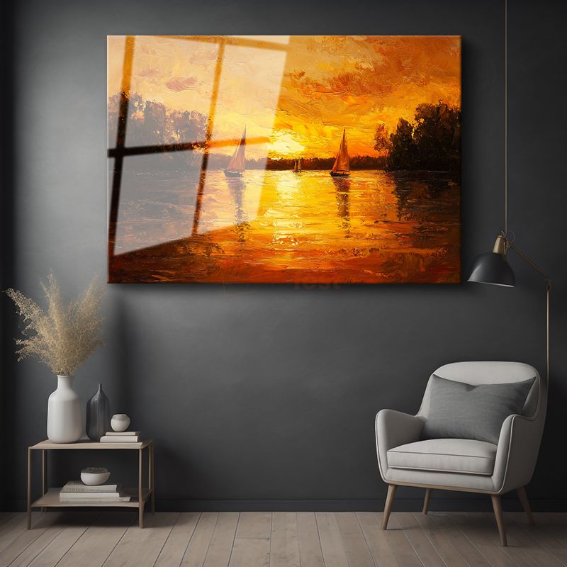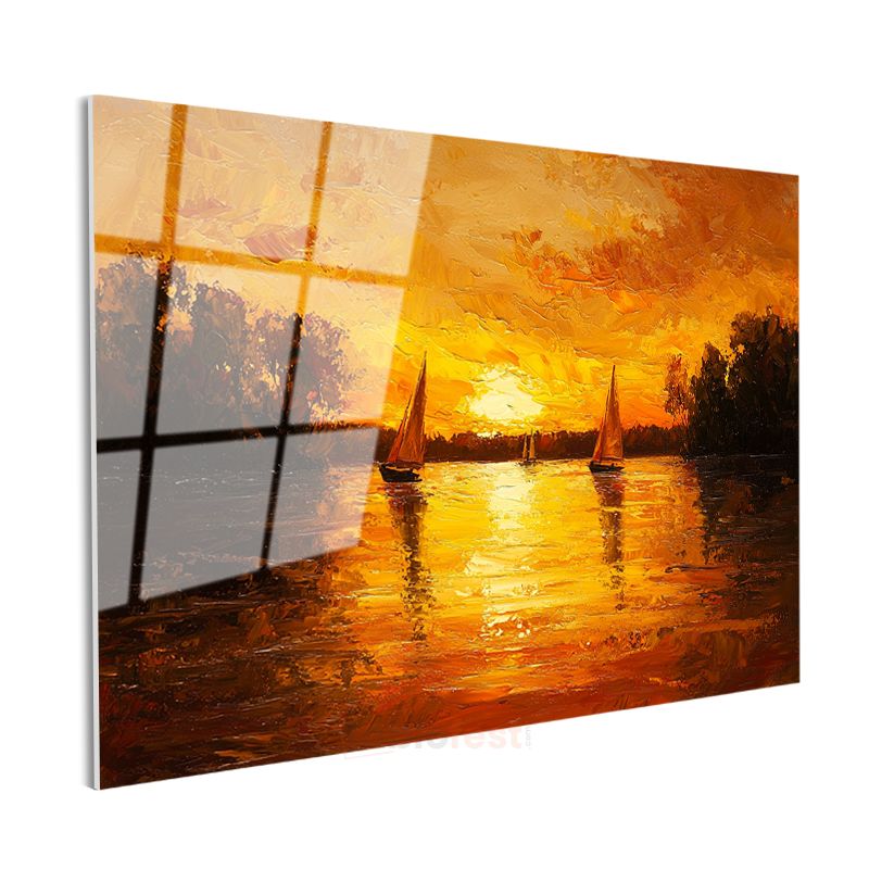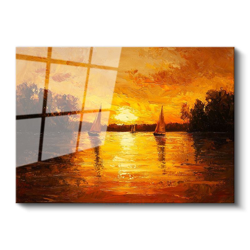 Yelkenliler - Turuncu Gün Batımında Huzurlu Seyir Cam Tablo