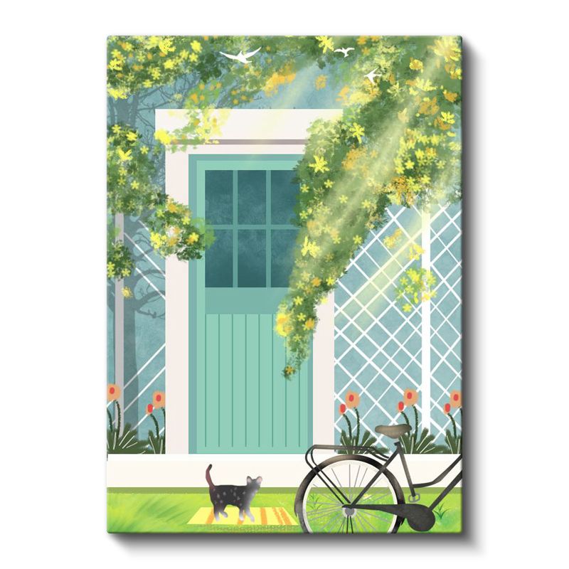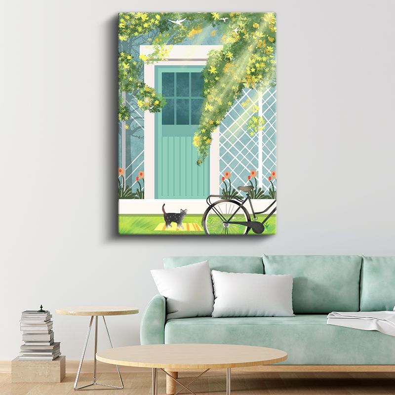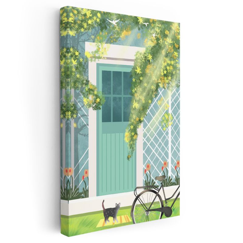 Yeşil Kapı - Çiçekli Bahçe ve Minik Dostlar Kanvas Tablo