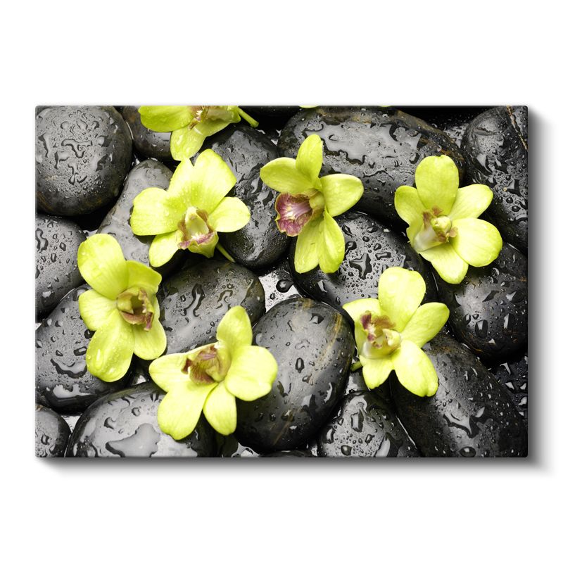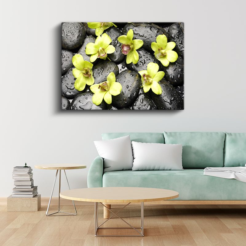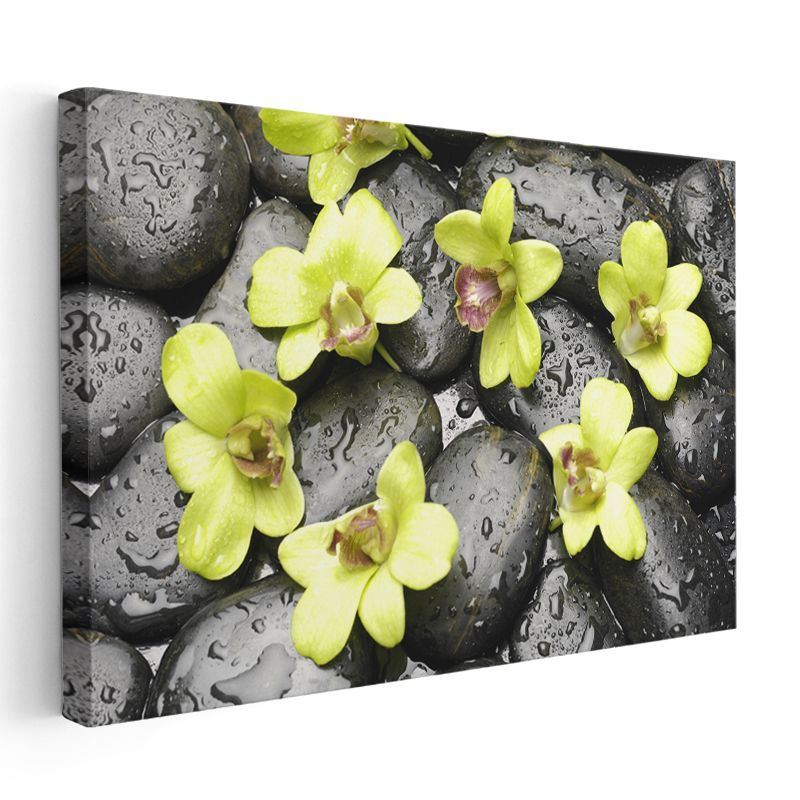 Yeşil Orkideler - Siyah Taşlar Üzerinde Zen Tasarımı Kanvas Tablo