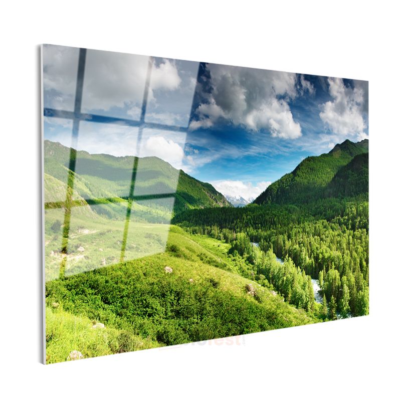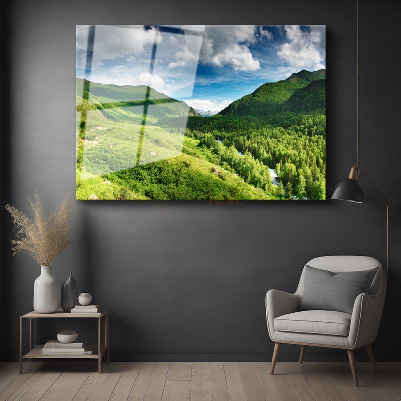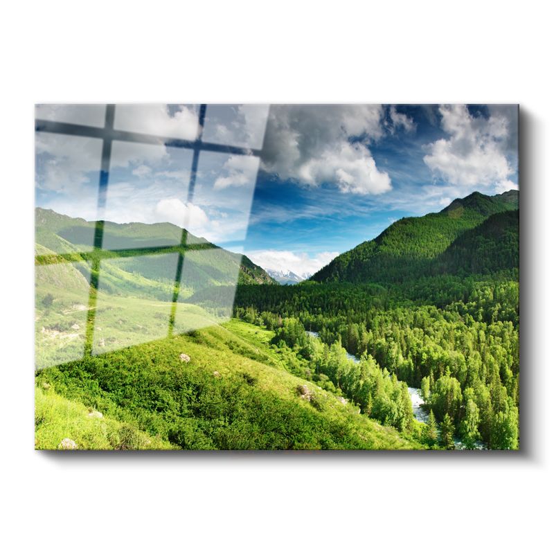 Yeşil Vadi - Ormanlar Arasında Akan Nehir Cam Tablo