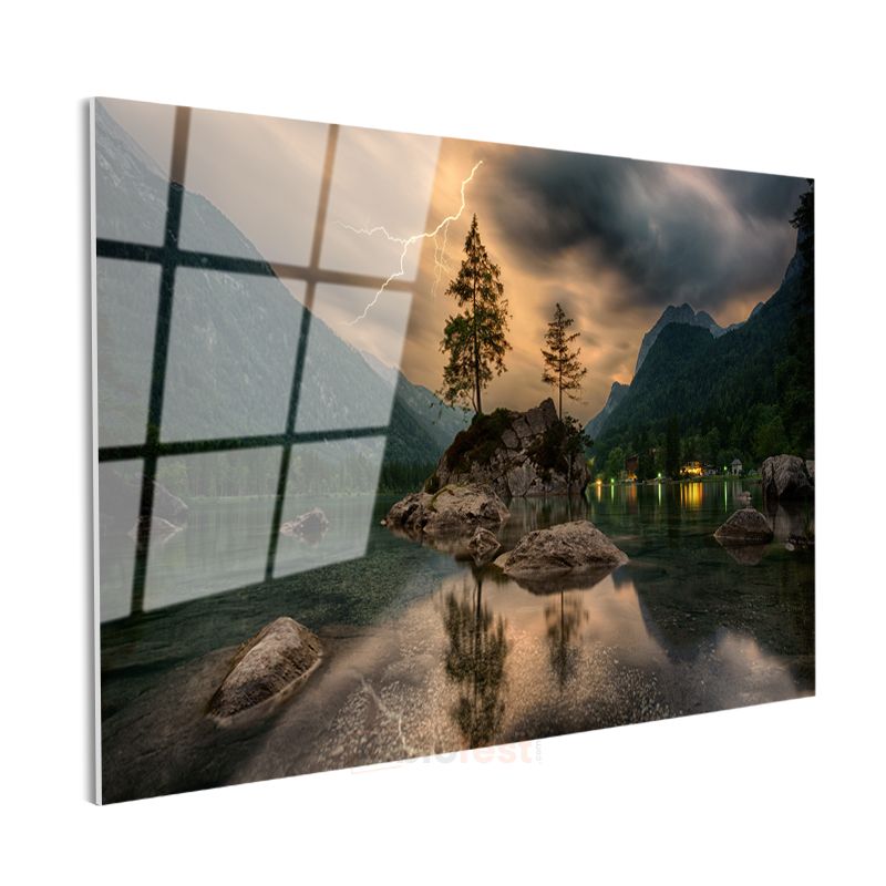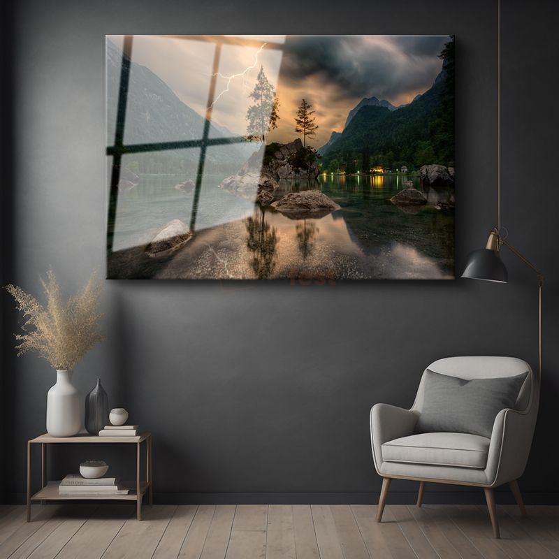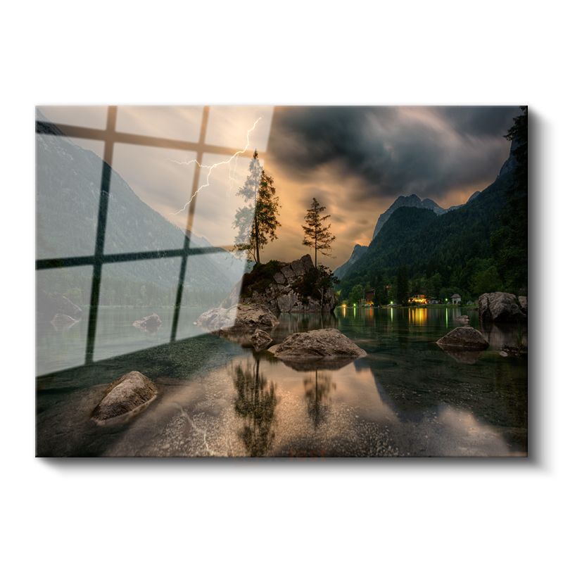 Yıldırım Çarpması - Göl Ortasındaki Kayalık Adacık Cam Tablo