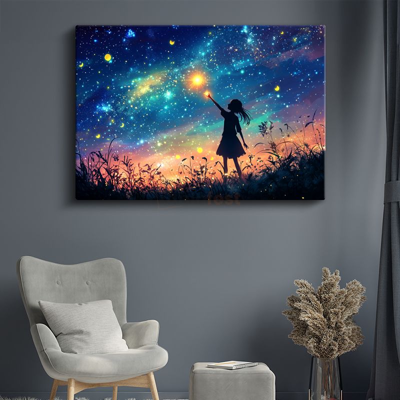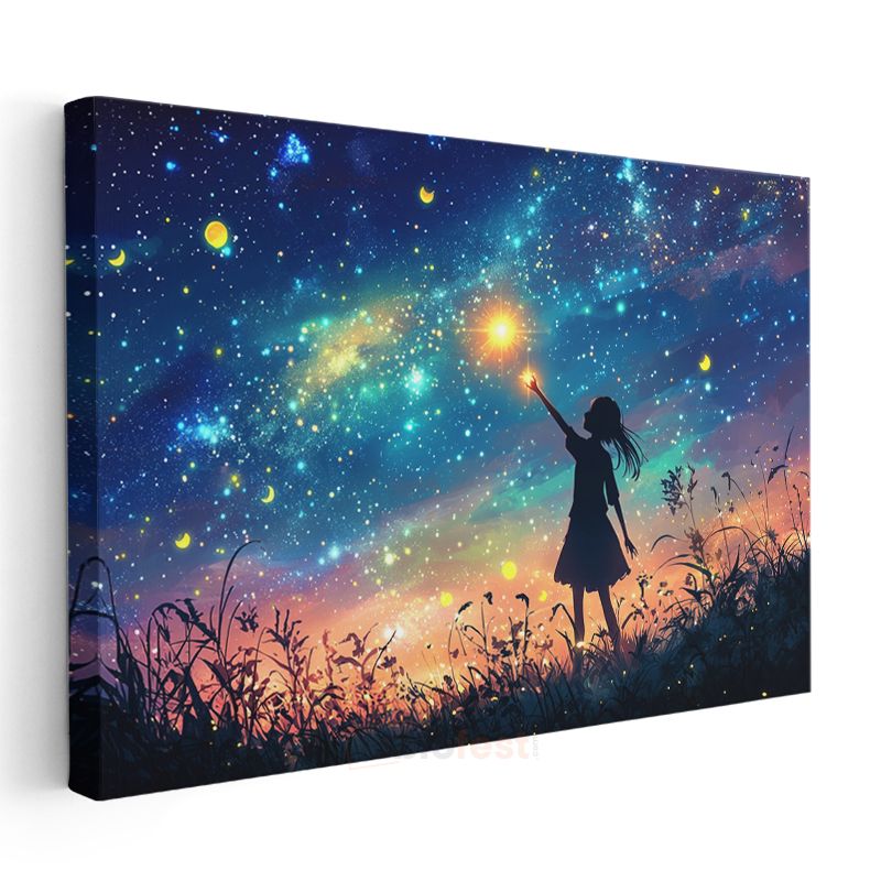 Yıldız Avcısı - Kozmik Işıkları Yakalamaya Çalışan Çocuk Silüeti Kanvas Tablo