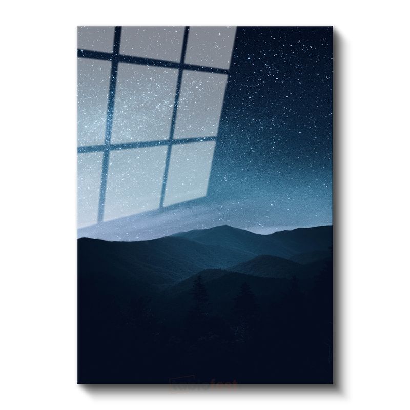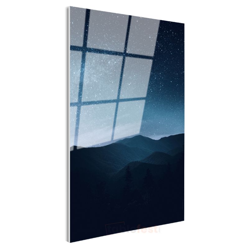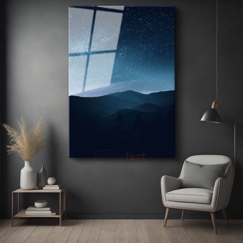 Yıldızlı Gece - Sessiz Dağ Silüetleri Cam Tablo