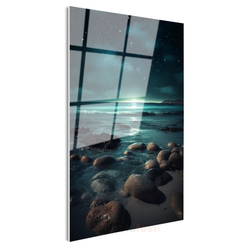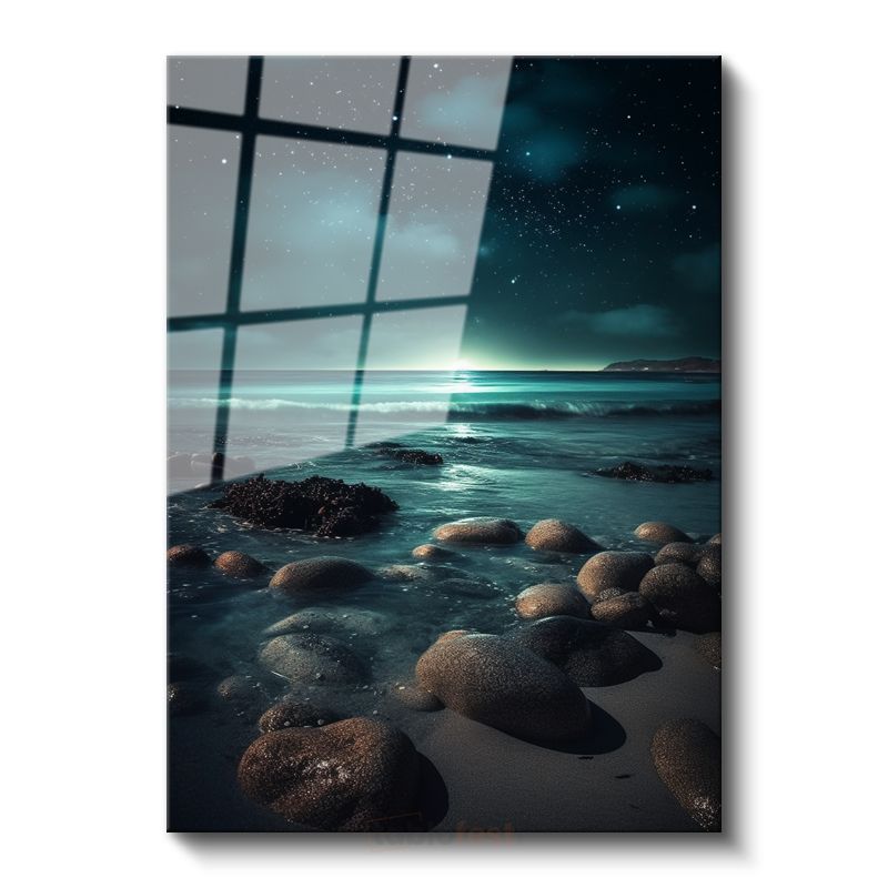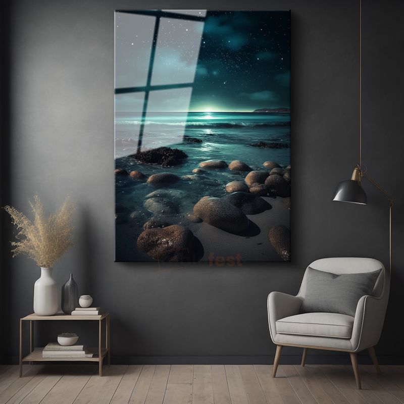 Yıldızlı Sahil - Gece Deniz Manzarası Cam Tablo