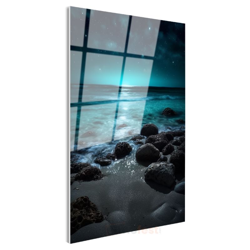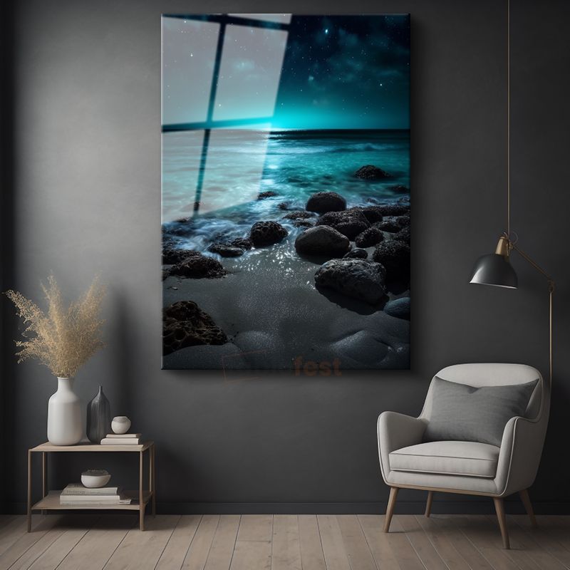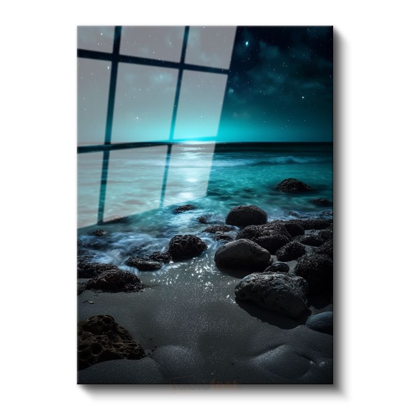 Yıldızlı Sahil - Turkuaz Gece Deniz Manzarası Cam Tablo
