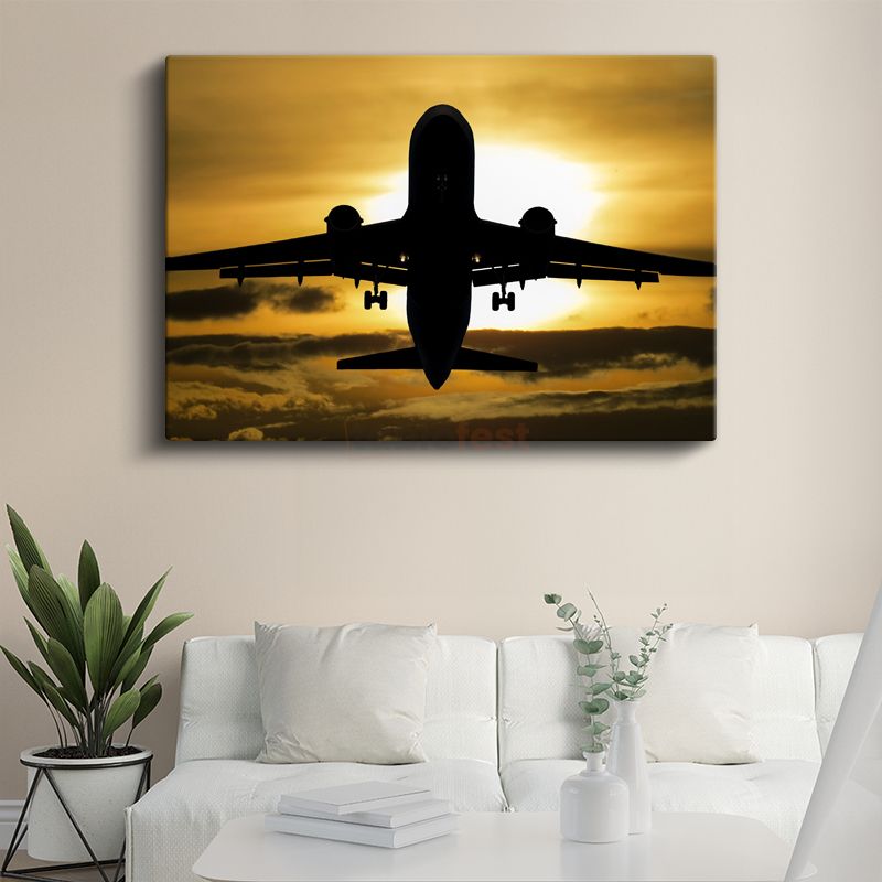 Yolcu Uçağı - Gün Batımında Siluet Kanvas Tablo