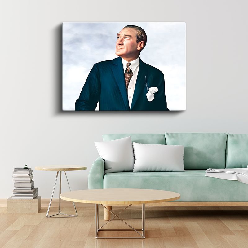 Yukarı Bakan Atatürk - Mavi Takım Elbiseli Kanvas Tablo