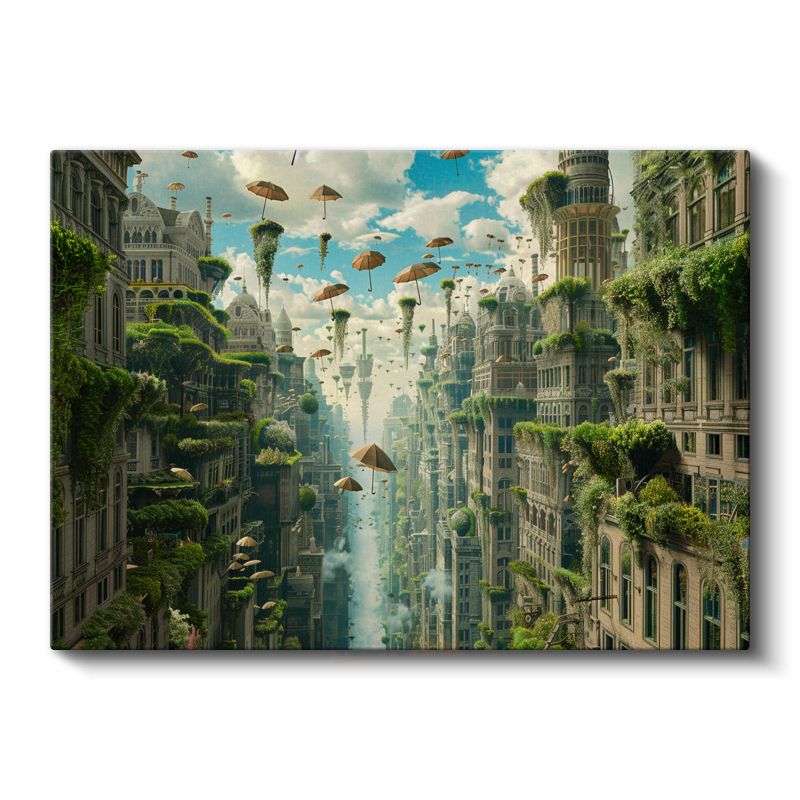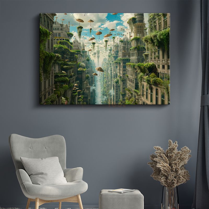 Yükselen Bahçeler - Havada Asılı Şemsiyeler ve Yeşil Şehir Kanvas Tablo