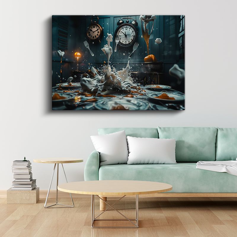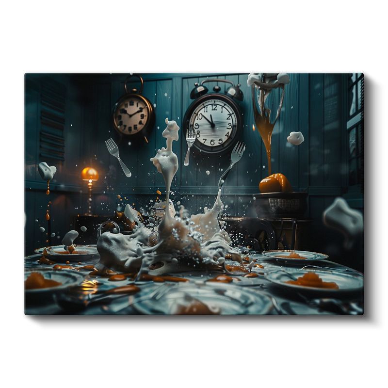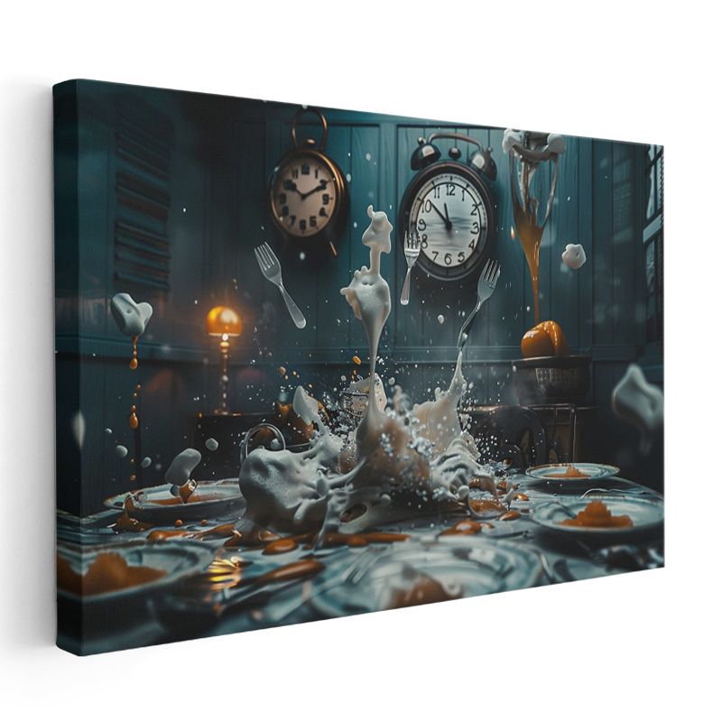 Zamanın Dansı - Havada Asılı Çatallar ve Saatlerle Sıçrayan Sıvı Kanvas Tablo