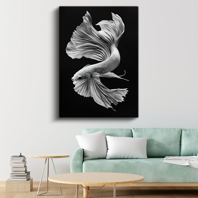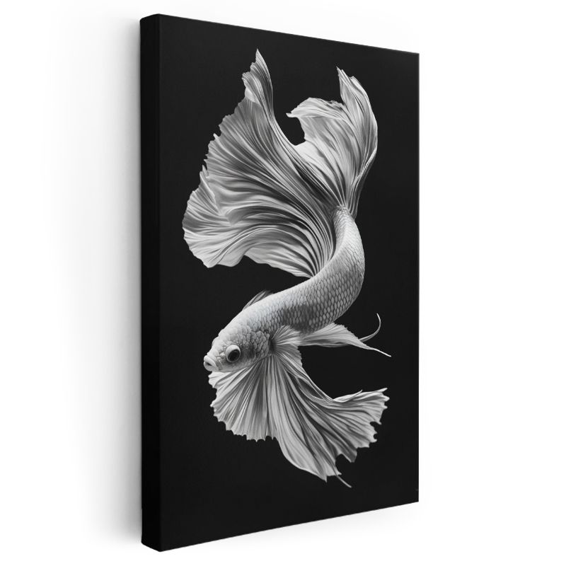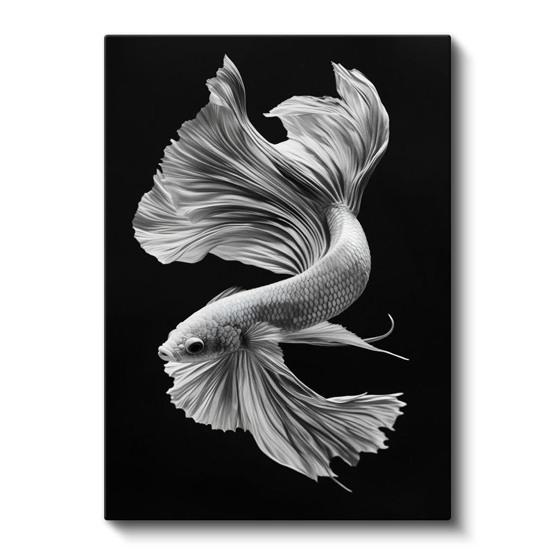 Zarif Beta Balığı - Siyah Zeminde Beyaz Tüllü Yüzgeçler Kanvas Tablo