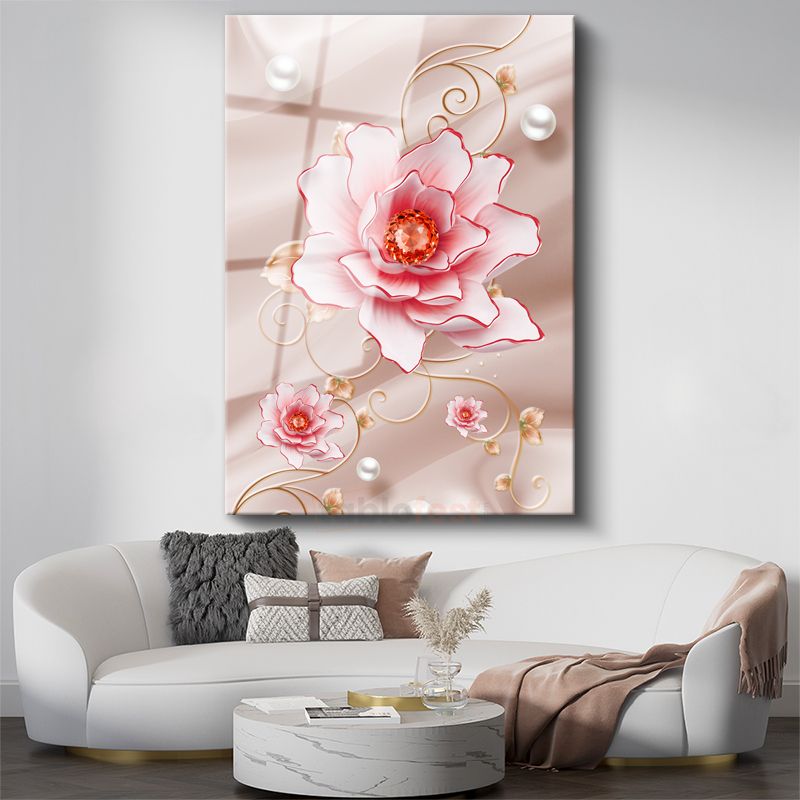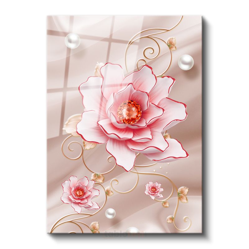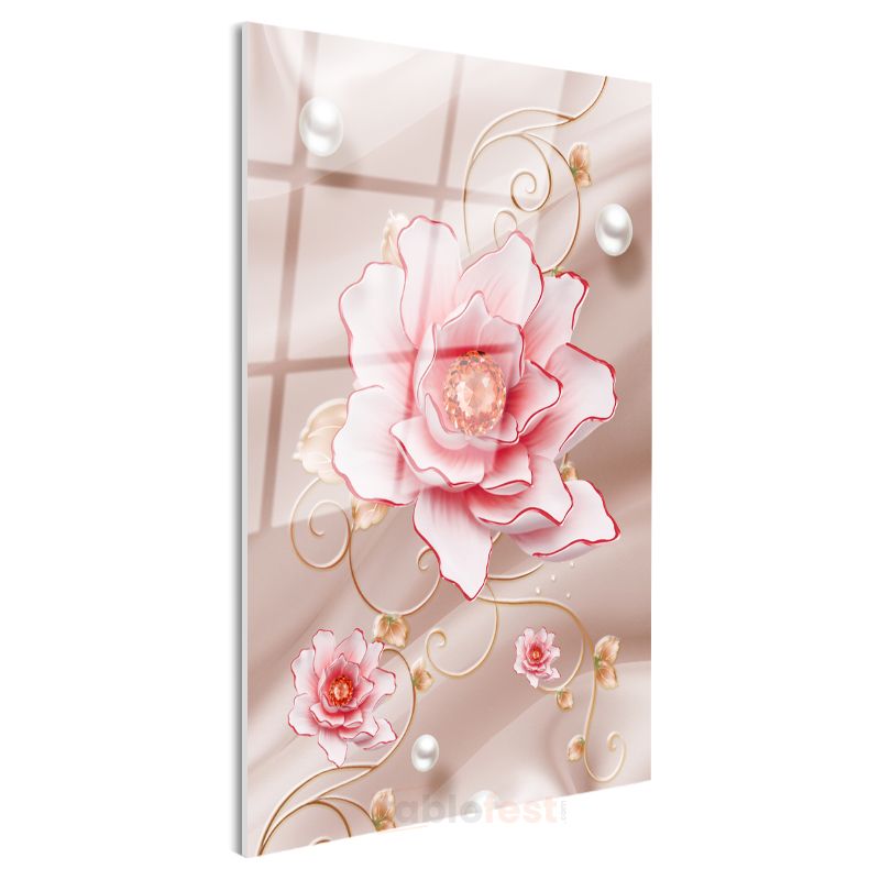 Zarif Çiçek İllüstrasyonu - İnci Detaylı Pembe Gül Cam Tablo