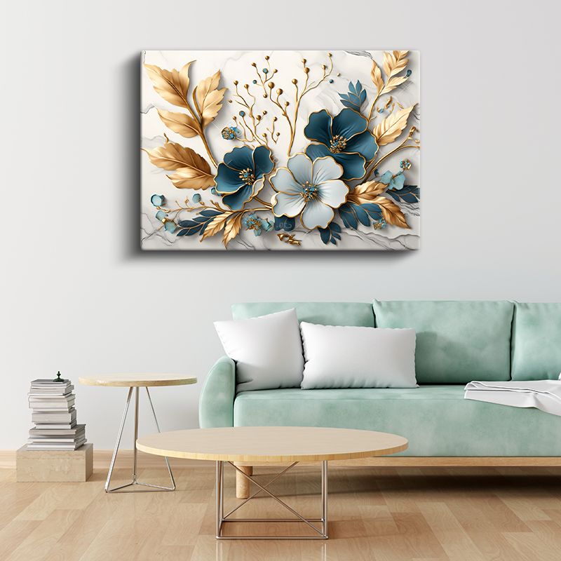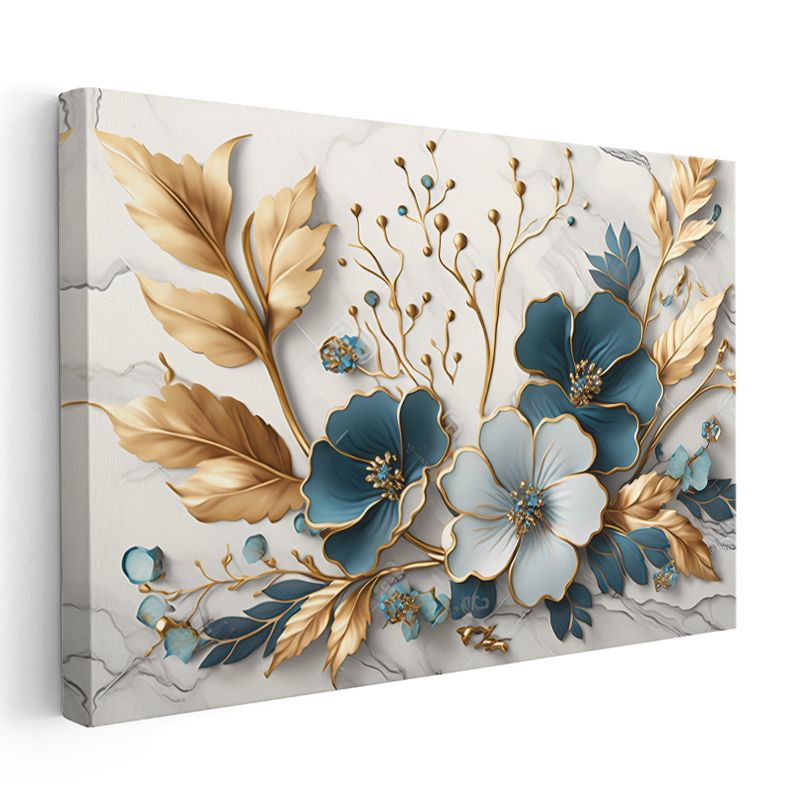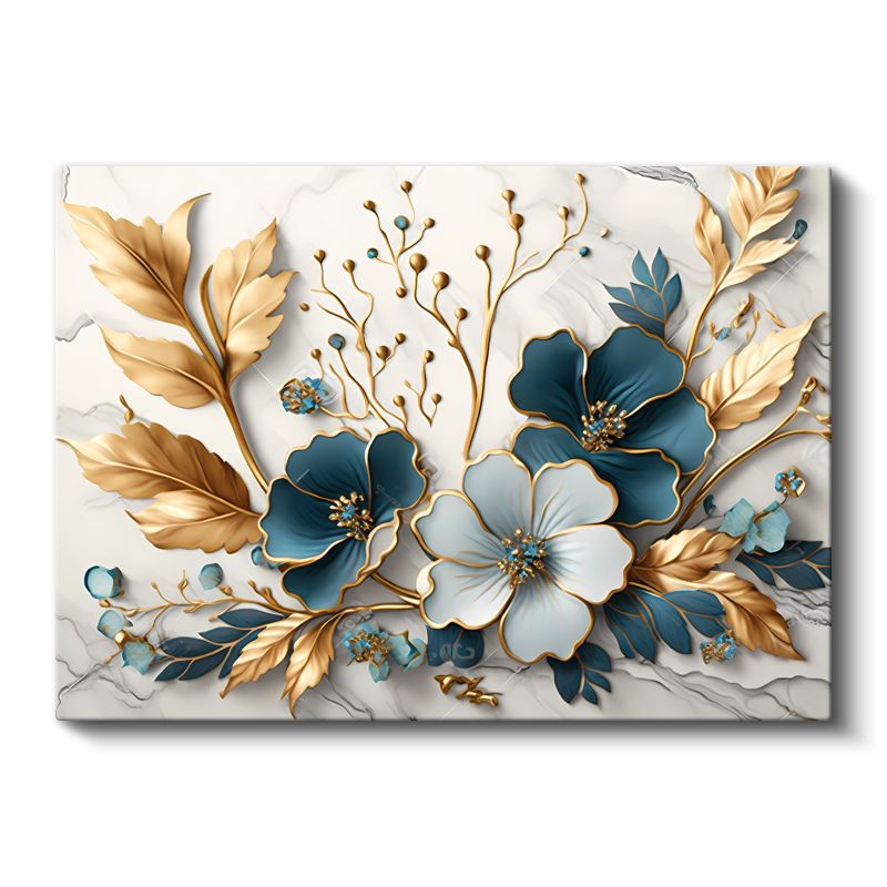 Zarif Çiçekler - Altın Detaylı Mavi ve Mor Çiçek Kompozisyonu Kanvas Tablo