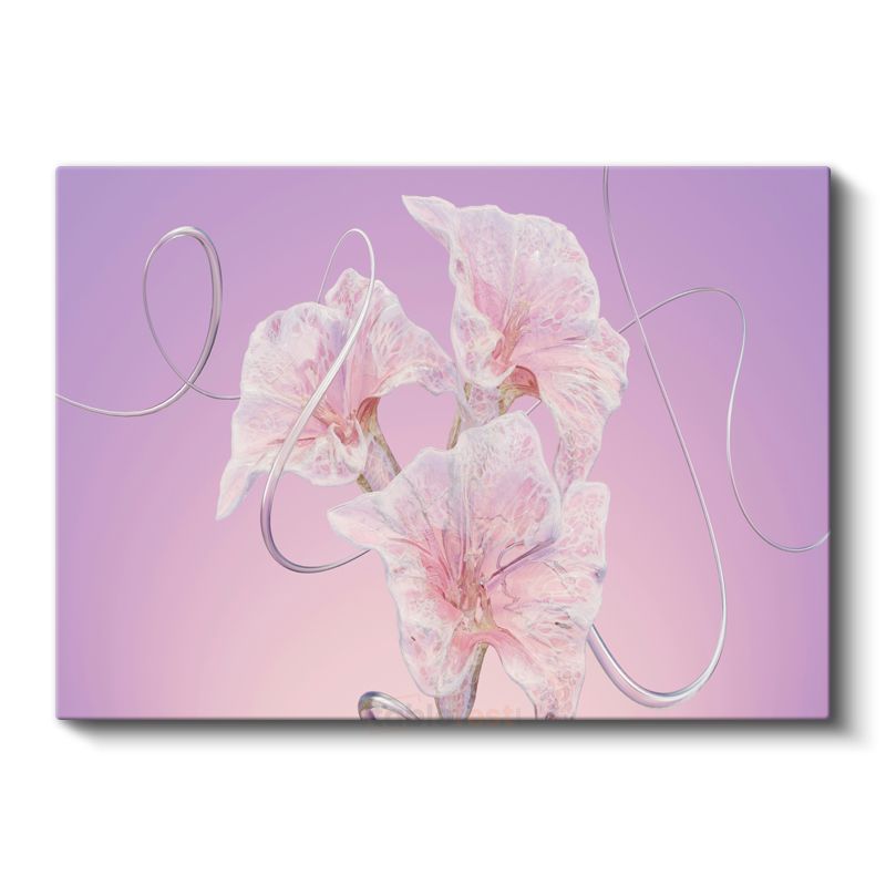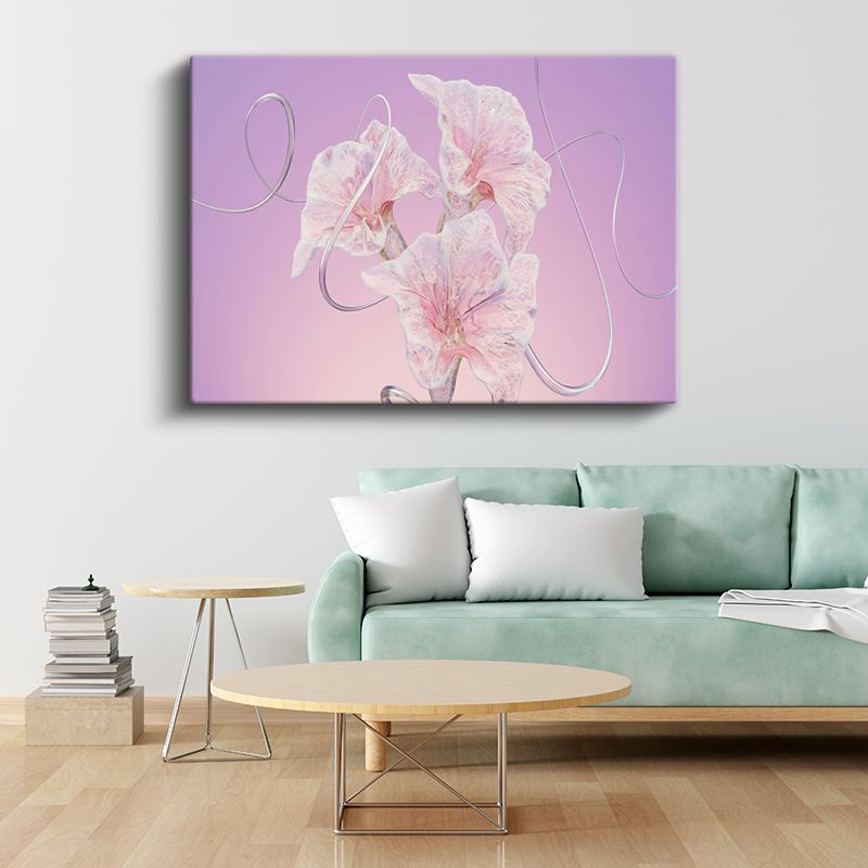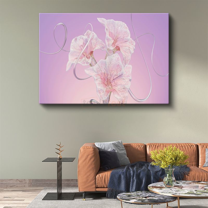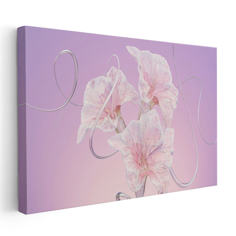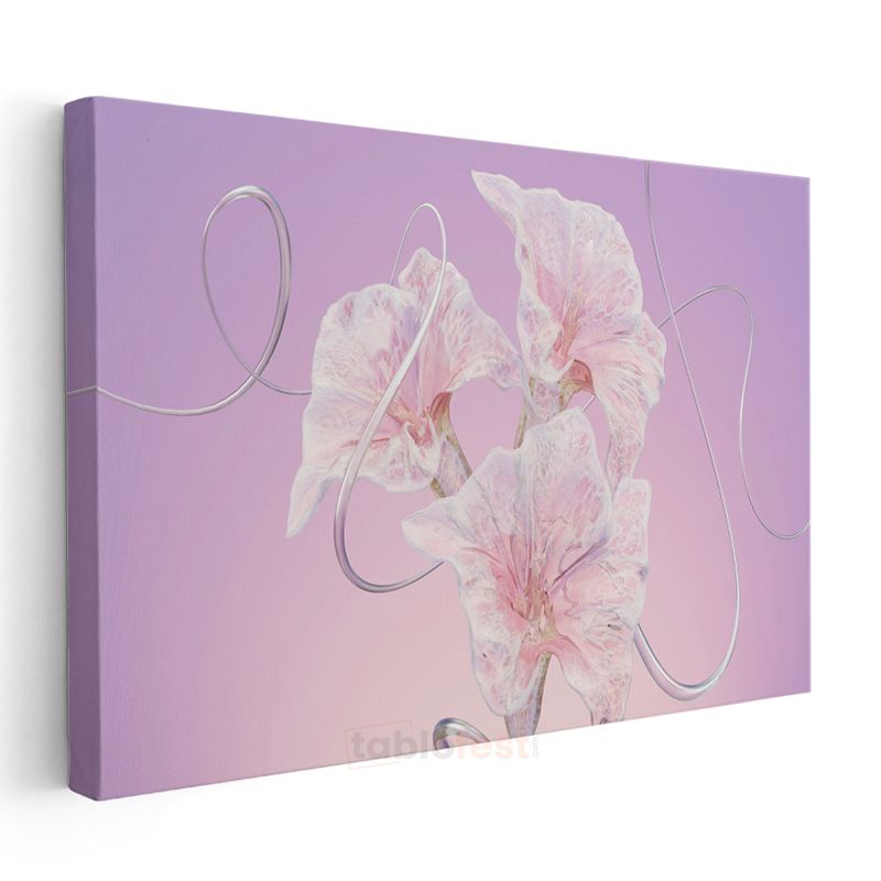 Zarif Çiçekler - Mor Zeminde Gümüş Detaylı Soyut Kanvas Tablo