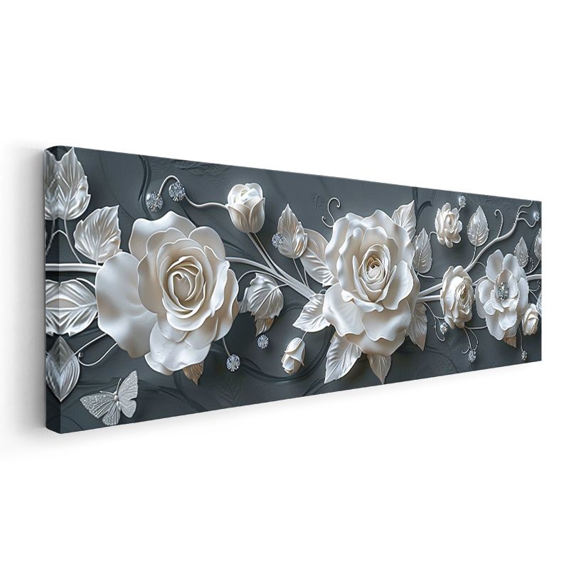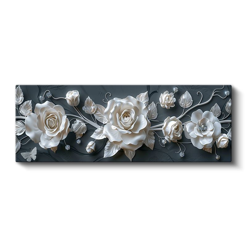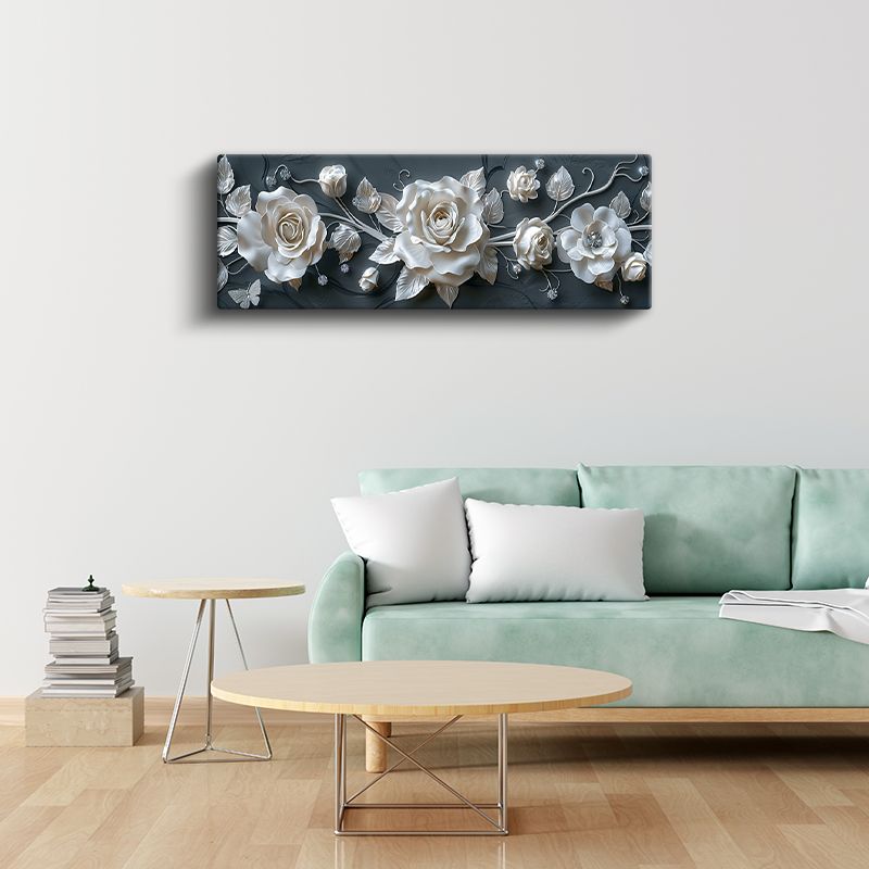 Zarif Güller - Koyu Gri Zeminde 3D Kabartma Görünümlü Beyaz Çiçekler Kanvas Tablo