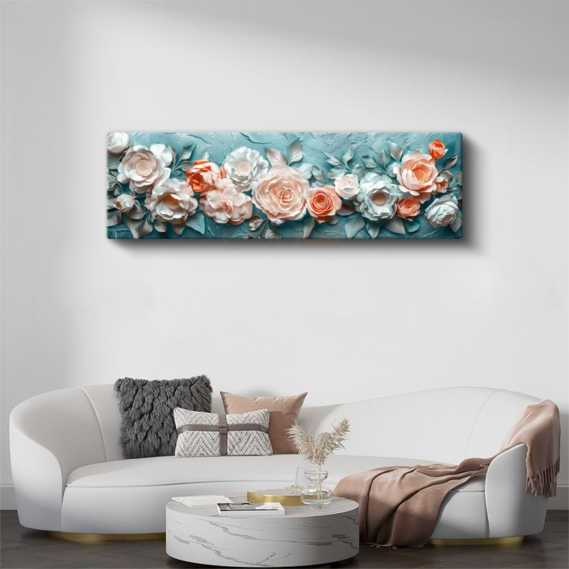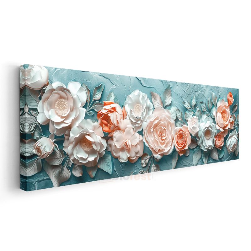 Zarif Güller - Turkuaz Zeminde 3D Kabartma Görünümlü Beyaz ve Somon Çiçekler Kanvas Tablo
