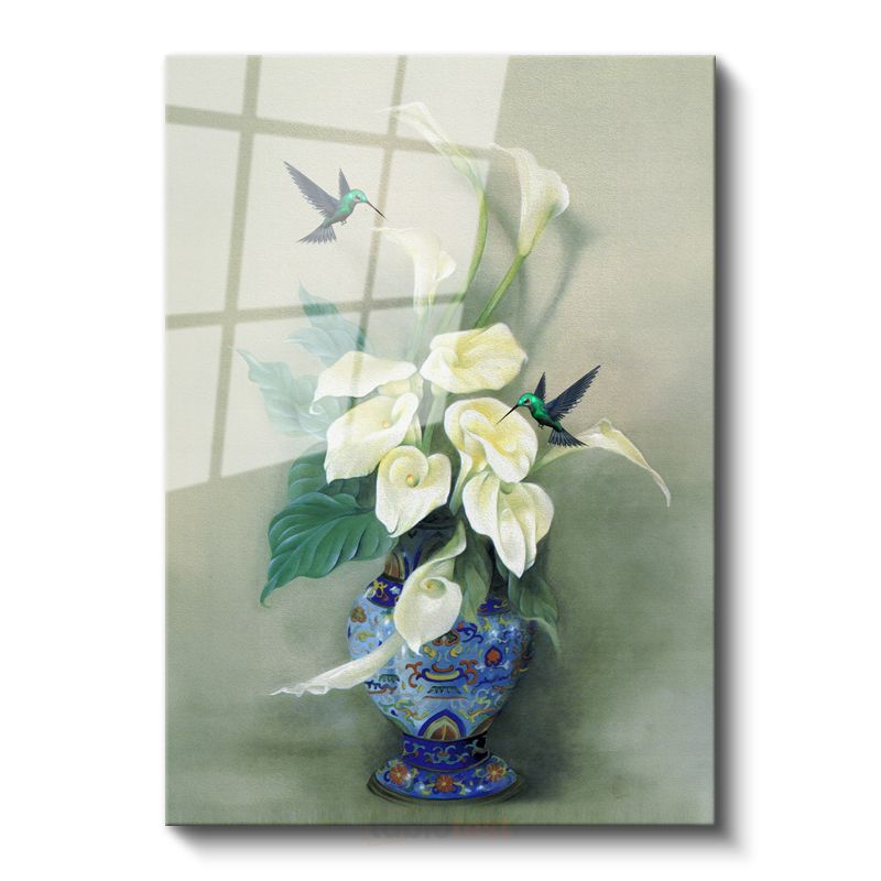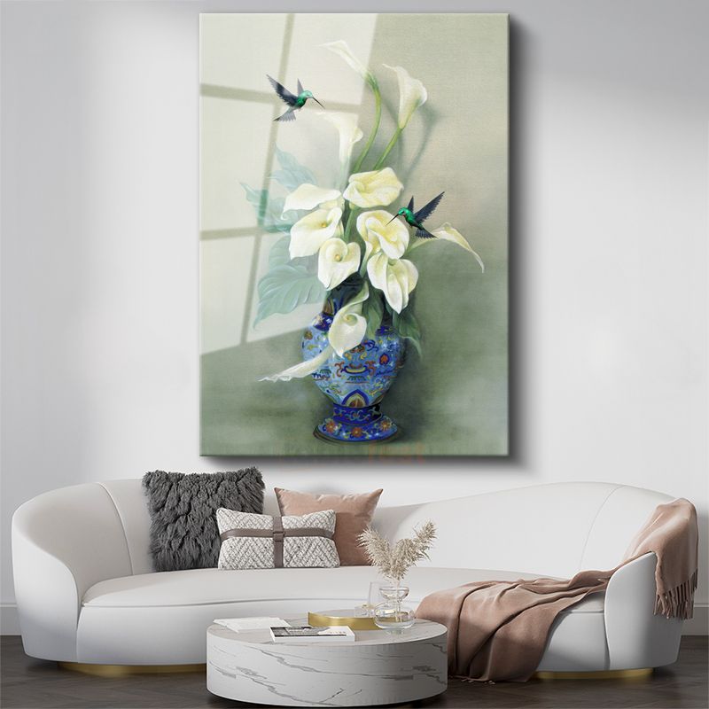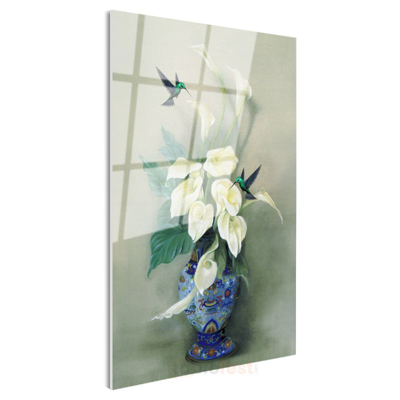 Zarif Kala Çiçekleri - Sinek Kuşları ile Beyaz Çiçek Buketi Cam Tablo
