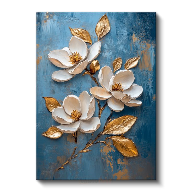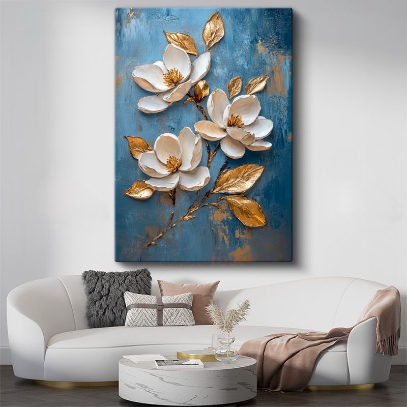 Zarif Manolya Çiçekleri - Mavi Fonda Altın Detaylı Kanvas Tablo