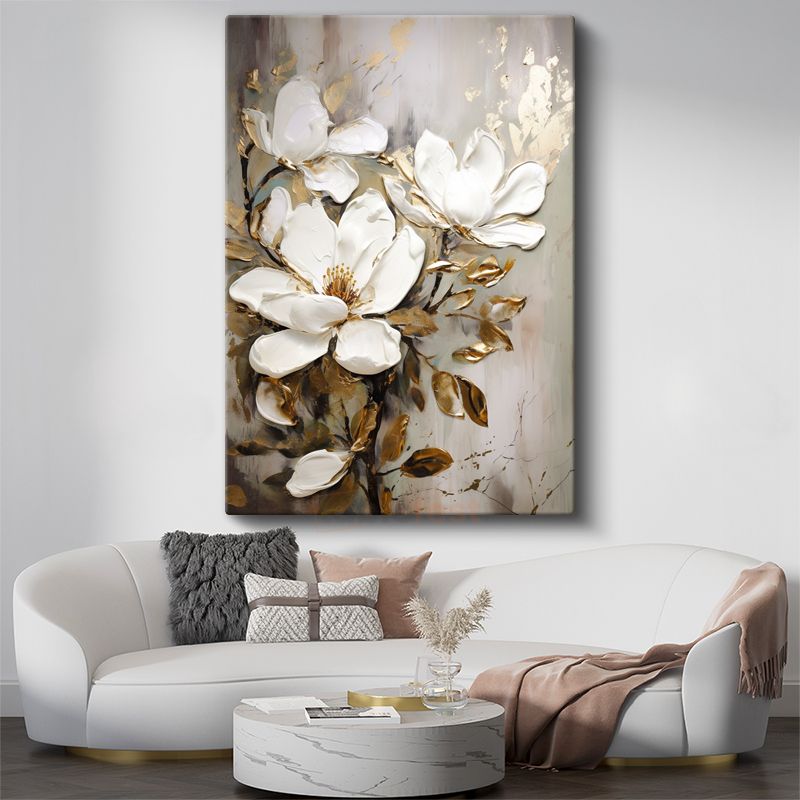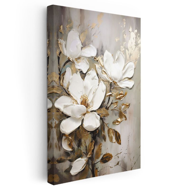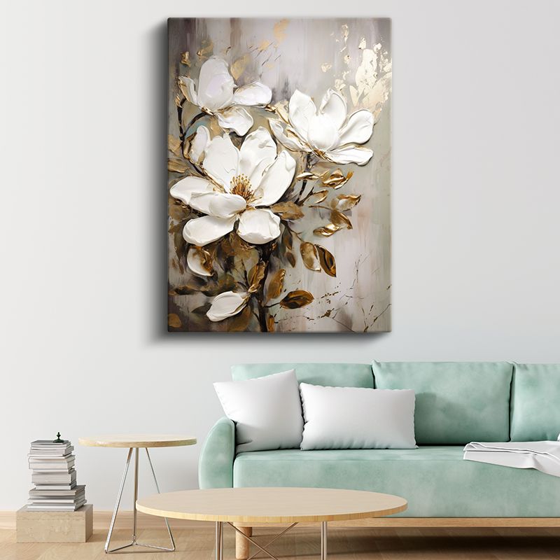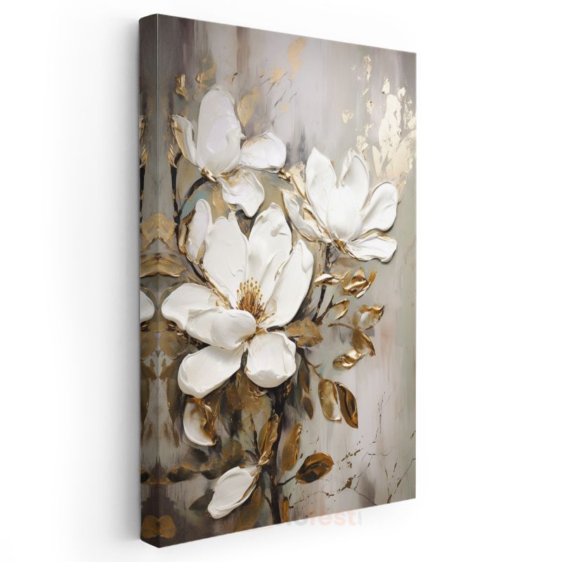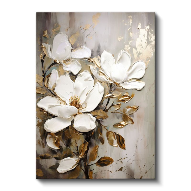 Zarif Manolyalar - Altın Yapraklı Beyaz Çiçek Kompozisyonu Kanvas Tablo