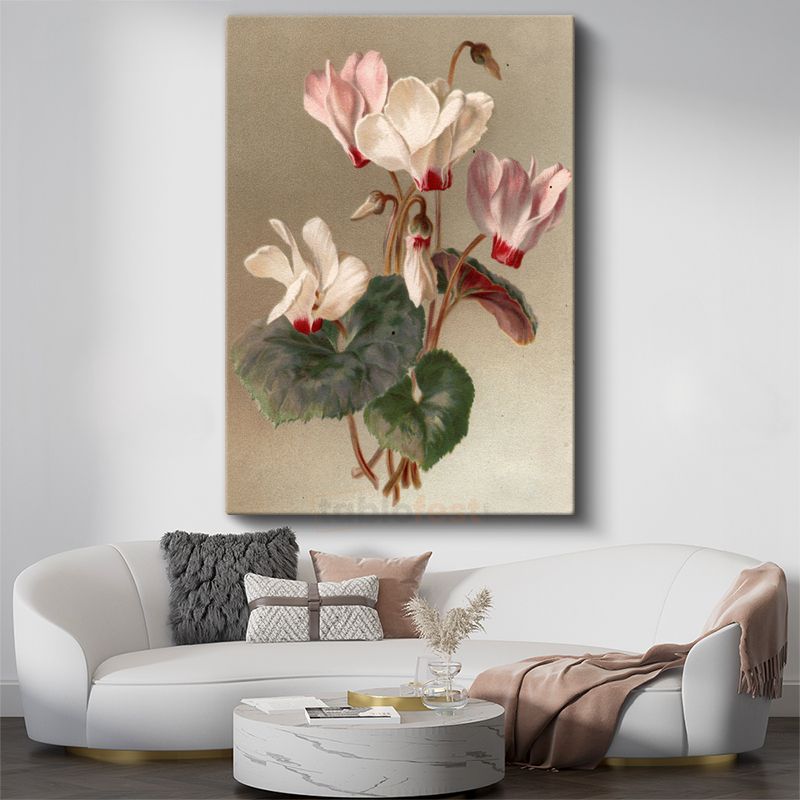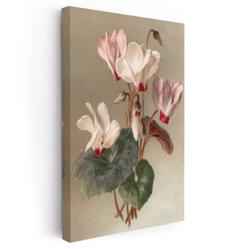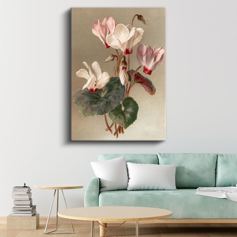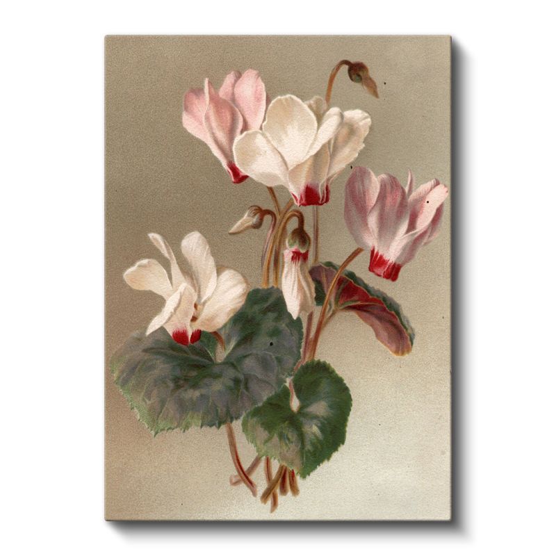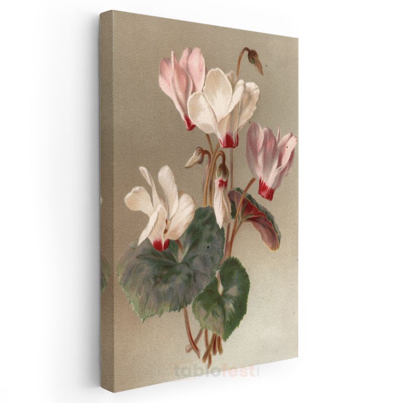Zarif Siklamen - Pembe Beyaz Çiçekler Vintage Botanik Kanvas Tablo