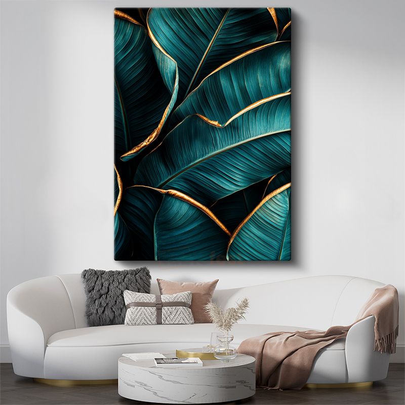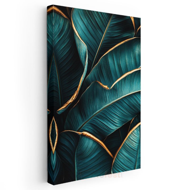 Zümrüt Yapraklar - Altın Kenarlı Tropikal Bitki Kanvas Tablo