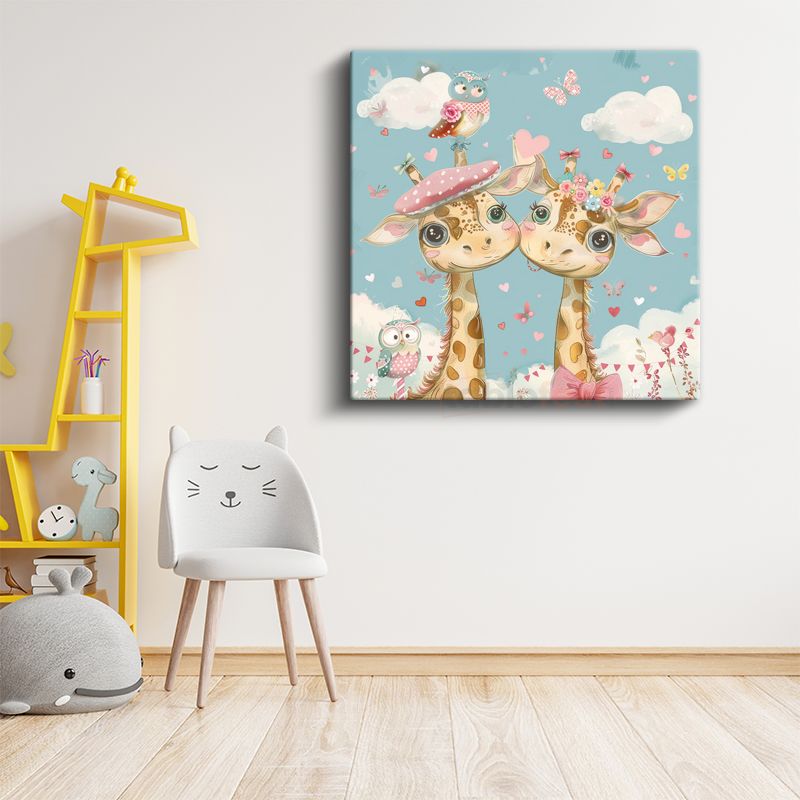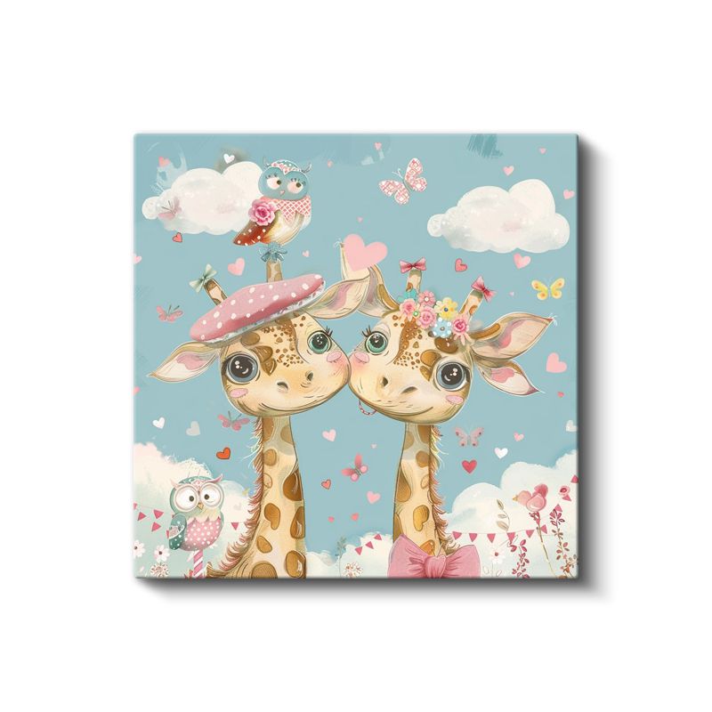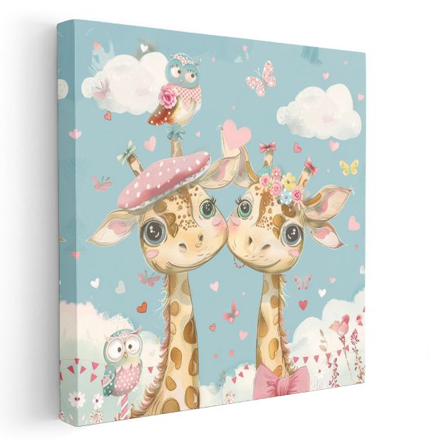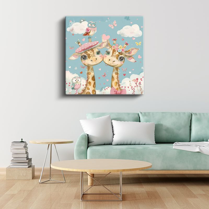 Zürafa Arkadaşlar - Şapkalı ve Çiçekli Sevimli Dostlar Kanvas Tablo
